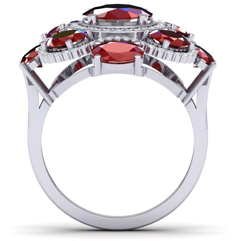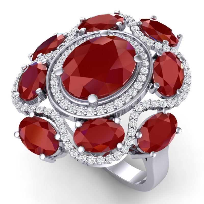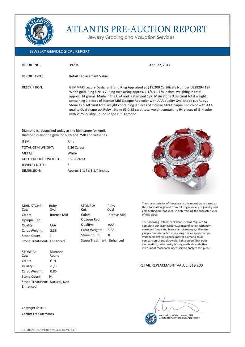 9.86 CTW Royalty Designer Ruby & VS Diamond Ring 18K White Gold ---- Luxury Designer Brand RIng Appraised Retail Price at $19,200 ---- SKU Number US39294 18K White gold RIng Size is 7, RIng measuring approx. 1 1/4 x 1 1/4 Inches, weighing in total approx. 14 grams. Made in the USA and is stamped 18K, Main stone 3.33 carat total weight containing 1 pieces of Intense Mid-Opaque Red color with AAA quality Oval shape cut Ruby , Stone #2 5.68 carat total weight containing 8 pieces of Intense Mid-Opaque Red color with AAA quality Oval shape cut