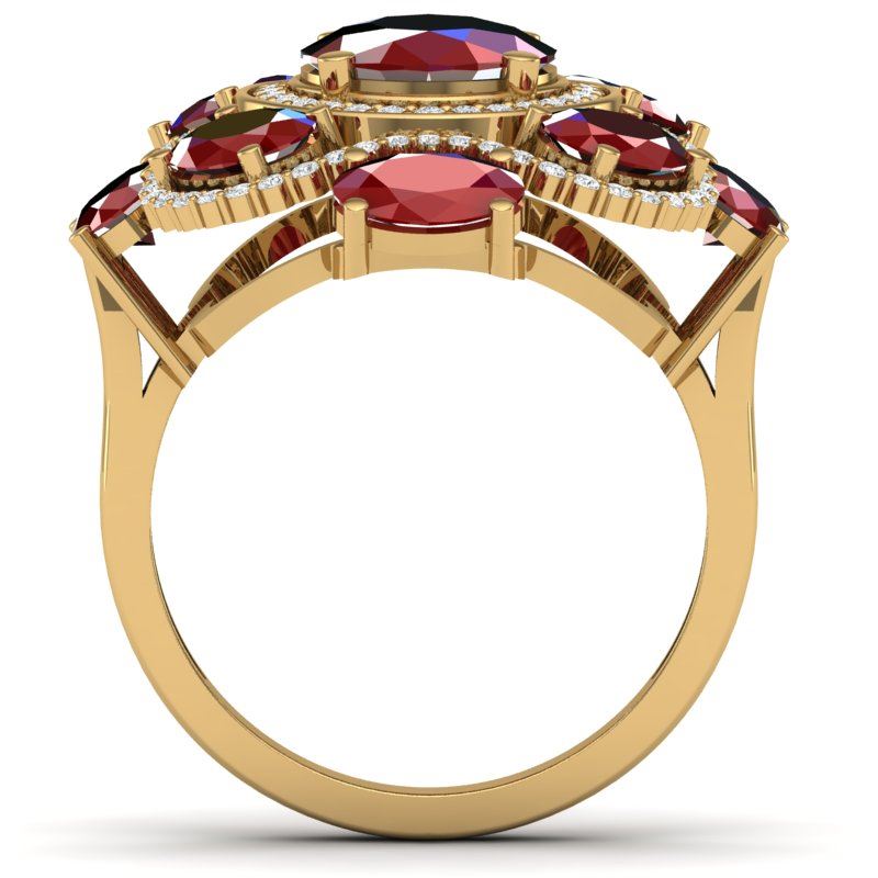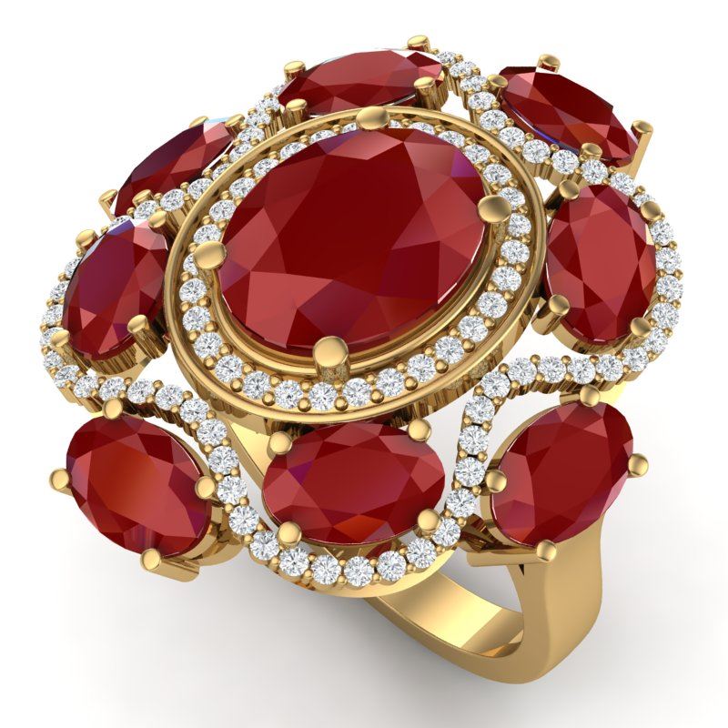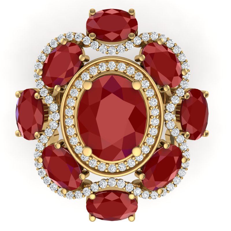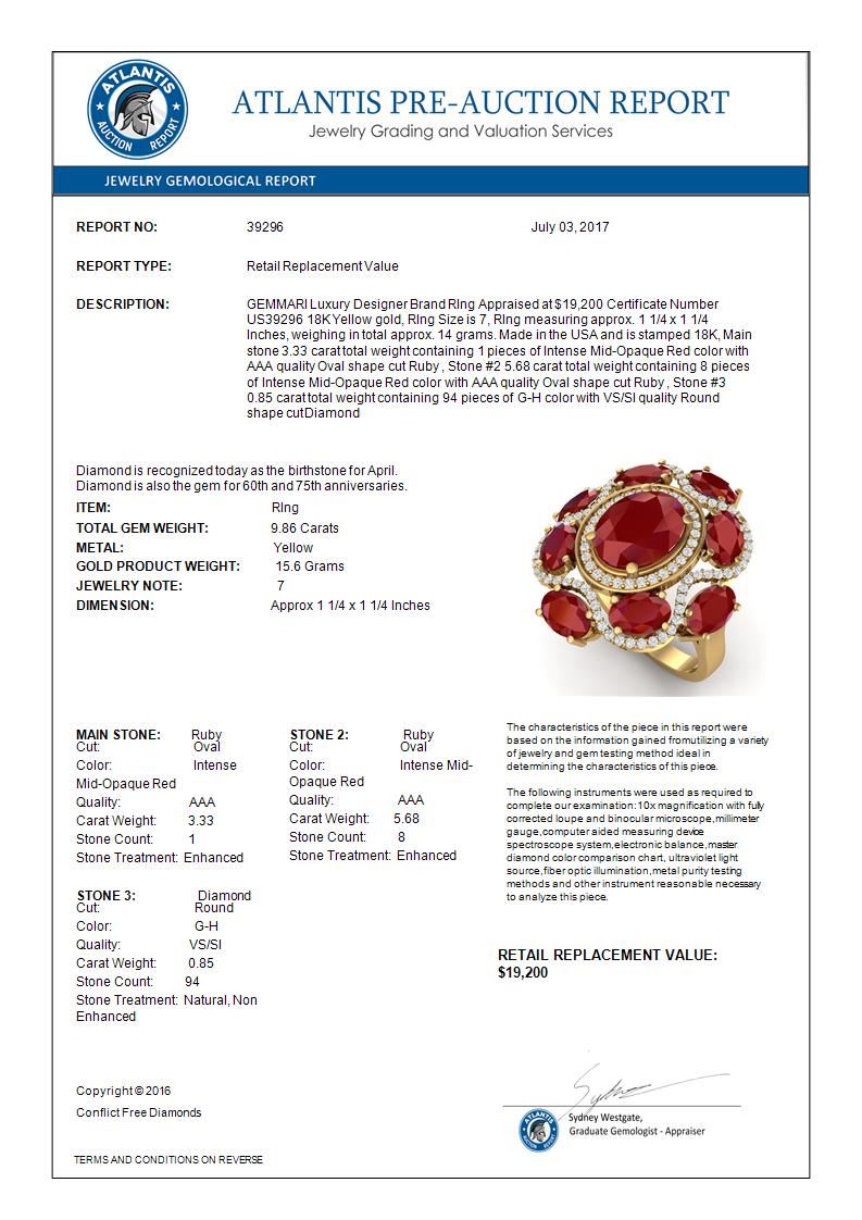 9.86 CTW Royalty Designer Ruby & VS Diamond Ring 18K Yellow Gold ---- Luxury Designer Brand RIng Appraised Retail Price at $19,200 ---- SKU Number US39296 18K Yellow gold RIng Size is 7, RIng measuring approx. 1 1/4 x 1 1/4 Inches, weighing in total approx. 14 grams. Made in the USA and is stamped 18K, Main stone 3.33 carat total weight containing 1 pieces of Intense Mid-Opaque Red color with AAA quality Oval shape cut Ruby , Stone #2 5.68 carat total weight containing 8 pieces of Intense Mid-Opaque Red color with AAA quality Oval shape cut