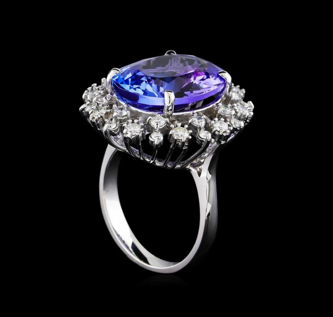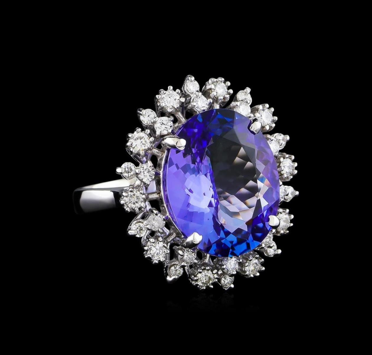 One electronically tested 14KT white gold ladies cast tanzanite and diamond ring with a bright polish finish. The featured tanzanite is set within a stylized diamond floret supported by a ribbed under gallery, completed by a three millimeter wide band. Identified with markings of "K14". Condition is new, good workmanship. Containing: One prong set oval mixed cut natural tanzanite, measuring 16.00 x 13.10 x 6.70mm, approximate weight of 9.88ct., clarity is eye clean, type I, medium dark, very slightly grayish, bluish violet color, (GIA bV 6/3), cut is good. Transmitting light with no distortion, transparent. Colored Stone Grading Report attached. Graded in the setting. Tanzanite is a very rare gemstone that is only found in the country of Tanzania. Originally discovered in 1967. Tiffany & Company, named the stone Tanzanite. It is found in the Usumburu Mountains that border the Umba Valley of northern Tanzania. Tanzanite occurs in gray, brown, violet, blue, reddish-purple, & green. The gem is interesting because of its exceptional pleochroism. Rotated in different directions a tanzanite will exhibit multiple changes of color. Tanzanite has a low tolerance to ultrasonic cleaning, and should not be cleaned using this method. Ten prong set round brilliant cut diamonds, measuring 2.00 - 2.00 x 1.20mm (depth est.) approximate total weight of 10 Stones = 0.29ct. Graded in the setting. Clarity: SI-2 to I-2. Color: G - I Ten prong set round brilliant cut diamonds, measuring 1.80 - 1.80 x 1.08mm (depth est.) approximate total weight of 10 Stones = 0.22ct. Graded in the setting. Clarity: SI-2 to I-2. Color: G - I Ten prong set round brilliant cut diamonds, measuring 1.50 - 1.50 x 0.90mm (depth est.) approximate total weight of 10 Stones = 0.12ct. Graded in the setting. Clarity: SI-2 to I-2. Color: G - I. Total Weight of Colored Stones 9.88ct. Total Weight of Diamonds 0.63ct. Total Weight of Ring 8.49gm. AIG Appraised.
