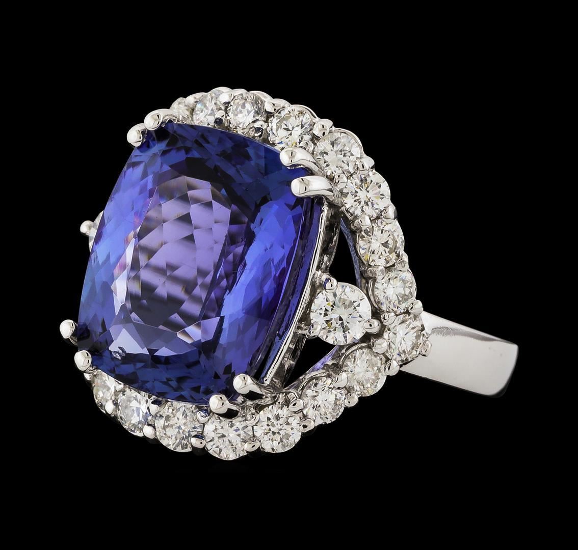 One electronically tested 14KT white gold lady's cast fashion ring with a split shank halo with a bright polish finish. The featured lady's ring has a shank measuring 2.90 millimeters wide. Identified with markings of 'K14'. Condition is new, good workmanship. Containing: One prong set rectangular cushion modified brilliant cut natural tanzanite, measuring 14.15 x 11.55 x 7.07mm, (depth est.) 8%. bulge factor, approximate weight of 9.88ct., clarity is eye clean, medium, moderately strong, violetish blue color, (GIA vB 5/4), cut is very good. Transmitting light with no distortion, transparent. Colored gemstones are presumed to have been subjected to commonly used enhancement processes. Graded in the setting. Two prong set round brilliant cut diamonds, measuring 3.10 - 3.05 x 1.91mm (depth est.) approximate total weight of 2 Stones = 0.22ct. Graded in the setting. Clarity SI-2. Color: H Cut Good Twenty-Two prong set round brilliant cut diamonds, measuring 2.60 - 2.50 x 1.53mm (depth est.) approximate total weight of 22 Stones = 1.31ct. Graded in the setting. Clarity SI-1 to SI-3. Color: G - I Cut Good. Total Weight of Colored Stones 9.88ct.. Total Weight of Diamonds 1.53ct.. Total Weight of Ring 9.40gm. GAS Appraised.