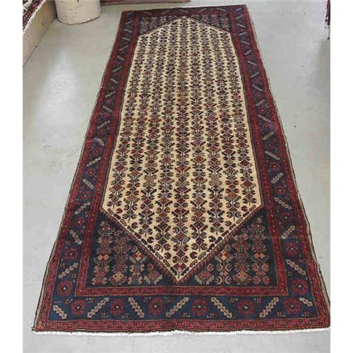 This is a beautiful runner rug from Koliyayee village in Kermanshah province of west Persia. wool pile, cotton foundation, hand woven, plush pile, cc 1990's, as new, plush pile, washed, clean. Size is 9' 9" x 3' 5" exc. cond, ready to use. Large peacocks all around the rug...As always combined shipping available to save you money.SHI by UPS to Canada $35 to your door no extra charges to USA $35...Any Q please call or email. Thanks