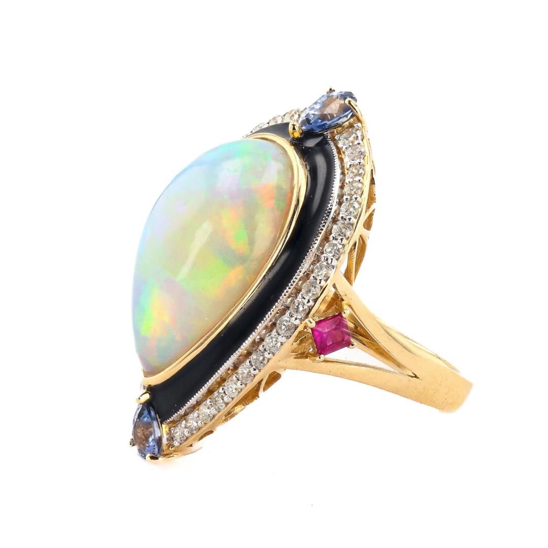 Fourteen karat (14K) two tone gold natural opal, sapphire/ruby corundum, and diamond ring. A pear cabochon cut natural opal gemstone is mounted in the center of the ring. Pear brilliant and square cut natural sapphire and ruby corundum gemstones and round