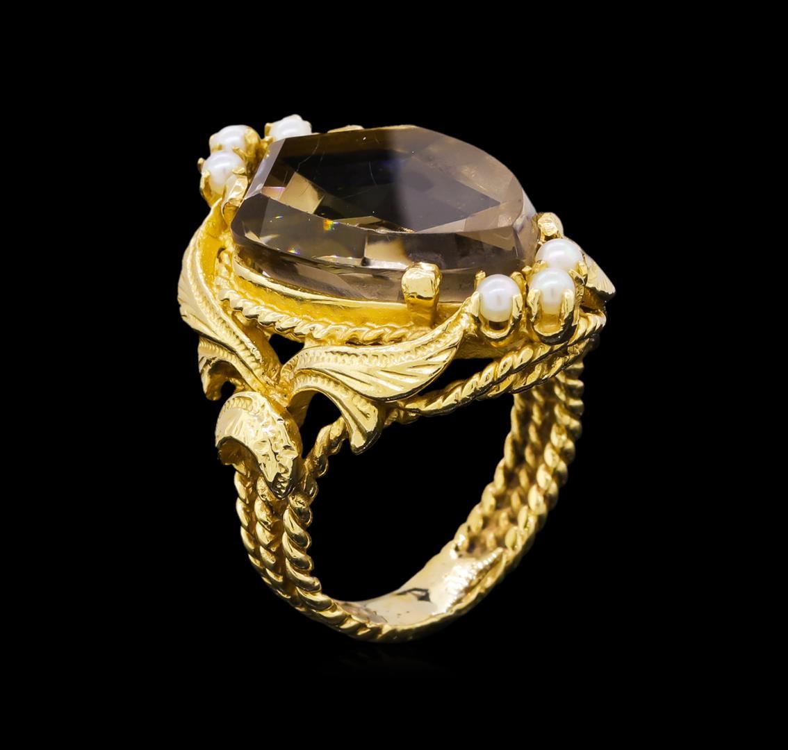 One electronically tested 14KT yellow gold ladies cast smoky quartz and seed pearl ring. The featured smoky quartz is set within an elaborate filigree frame with seed pearl accents supported by three-way split rope style shoulders, completed by a four millimeter wide band. Patterned finish. Condition is good. Containing: One prong set modified shield cut natural smoky quartz, measuring 20.00. x 13.10 x 7.10mm, approximate weight of 9.90ct., clarity is eye clean, medium, slightly grayish, brown color, (GIA Br 5/2), cut is good. Transmitting light with no distortion, transparent. Colored Stone Grading Report attached. Graded in the setting. Six seed pearls, 2.0mm in size to 2.0mm in size. The pearls are white in color with a very good luster, round to near round, mostly clean Graded in the setting. A seed pearl is a small natural pearl, formed in either a saltwater oyster or fresh water mussel, that is usually less the a one-quarter grain in weight and smaller then 2mm in size and off-round in shape. In jewelry they are used as decorative borders, tiny accents in small patterns or in larger clusters woven together to make up an entire piece of jewelry. One of the most historically famous examples of seed pearl jewelry is that of a seed pearl suite (a necklace and two matching bracelets) purchased on April 28, 1862 from Tiffany and Co. for Mary Todd Lincoln from President Abraham Lincoln to wear to the first Lincoln inaugural ball.. Total Weight of Colored Stones 9.90ct.. Total Weight of Ring 11.95gm. AIG Appraised at $2,225.00.