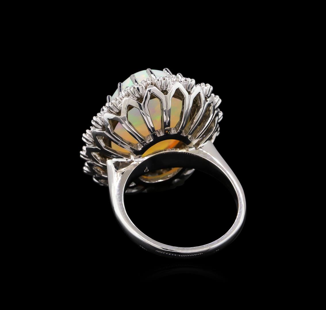 One electronically tested 14KT white gold ladies cast opal and diamond ring with a bright polish finish. The featured opal is set within tiered diamond bezels supported by ribbed under gallery, completed by a two millimeter wide band. Identified with markings of "K14". Condition is new, good workmanship. Containing: One crystal opal that is cut in a oval shaped cabochon and is prong set, measuring 18.00 mm long x 14.00 mm wide, and 8.50 mm thick and the approximate weight is 9.92 carats. The opal has a bright, green-blue play of color (fire) in a flashfire pattern; a medium dome; a good cut; no inclusions; consistent in its brightness and pattern; and is slightly directional. Graded in the setting. Thirty-Six prong set round brilliant cut diamonds approximate total weight of 36 Stones = 0.90ct. Graded in the setting. Clarity: VS-1 to SI-1. Color: D - F. Total Weight of Diamonds 0.90ct. Total Weight of Opals 9.92ct. Total Weight of Ring 10.50gm. AIG Appraised at $7,720.00.