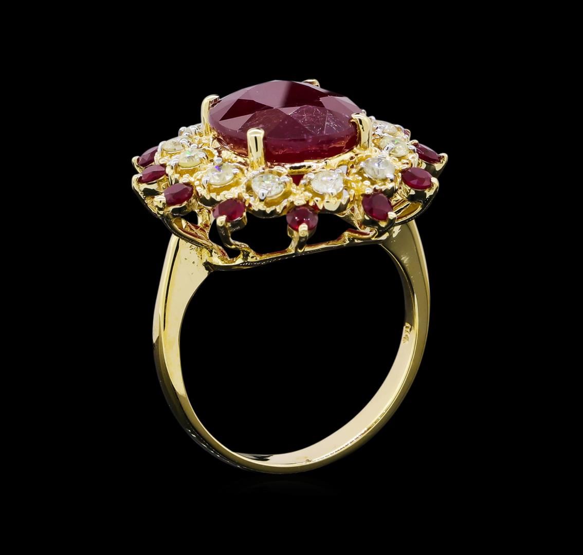 Fourteen karat (14K) yellow gold ruby and diamond ring. One (1) oval and twelve (12) round cut ruby corundum gemstones are prong mounted in the center of the ring. Round brilliant cut diamonds accent the ring around the center gemstones. The ring is cast stamped "14K" and has a gross weight of 7.5 grams. Diamond(s): Shape: Round brilliant cut. Weight: 0.58 carat (12 pcs). Average clarity: Si2-I1. Average color: H-J. Symmetry: Very good. Polish: Very good. Gemstone(s): Gemstone: Ruby corundum. Nature: Natural. Shape: Oval and round, faceted. Quantity: 13, mounted (1 center and 12 side stones). Weight: 9.92 carat total (9.10ctw. Center and 0.82ctw. Side stones). Center stone dimensions: Length-12.91 mm. ; Width-10.73 mm. Bulge: Visible. Clarity: SI, type 2/3. Color: Red (5/5). Symmetry: Very good. Color intensity: Medium. Transparency: transparent. Tone: Dark. Enhancements: Indications of high temperature heat treatment, with glass and flux additives. Metal(s): Metal: gold, stamped. Purity: 14K. Color: Yellow. Condition: Excellent. Finish: High polish. GGA Appraised at $5,980.00.