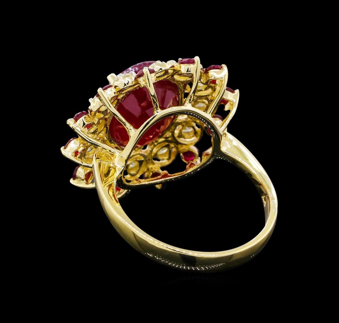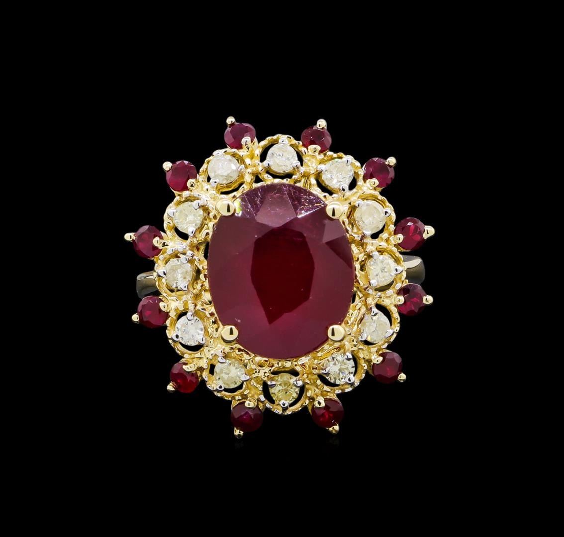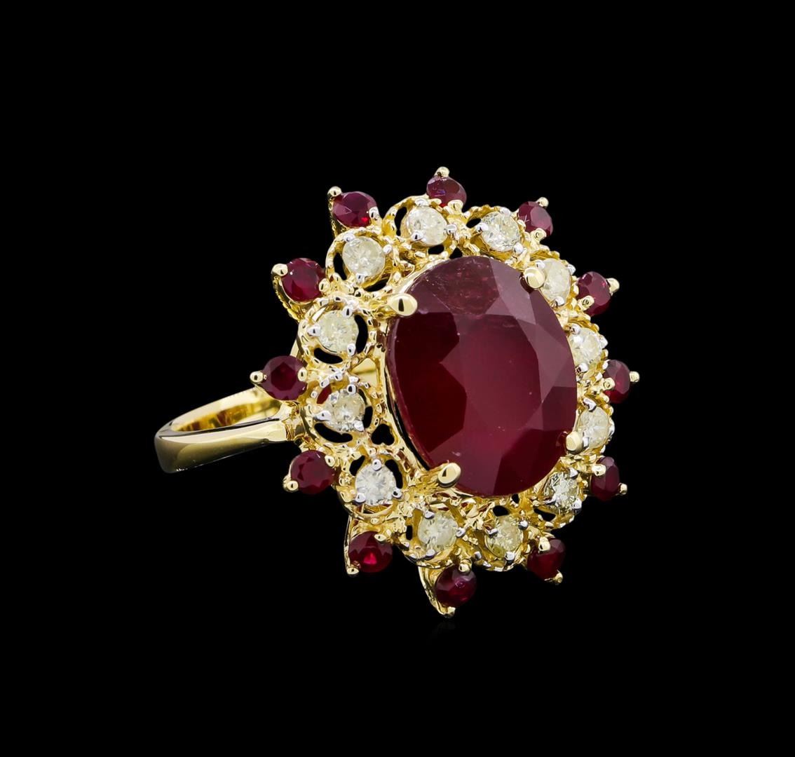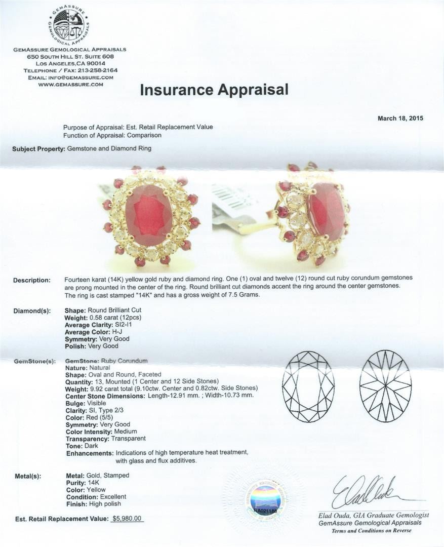 Fourteen karat (14K) yellow gold ruby and diamond ring. One (1) oval and twelve (12) round cut ruby corundum gemstones are prong mounted in the center of the ring. Round brilliant cut diamonds accent the ring around the center gemstones. The ring is cast stamped "14K" and has a gross weight of 7.5 grams. Diamond(s): Shape: Round brilliant cut. Weight: 0.58 carat (12 pcs). Average clarity: Si2-I1. Average color: H-J. Symmetry: Very good. Polish: Very good. Gemstone(s): Gemstone: Ruby corundum. Nature: Natural. Shape: Oval and round, faceted. Quantity: 13, mounted (1 center and 12 side stones). Weight: 9.92 carat total (9.10ctw. Center and 0.82ctw. Side stones). Center stone dimensions: Length-12.91 mm. ; Width-10.73 mm. Bulge: Visible. Clarity: SI, type 2/3. Color: Red (5/5). Symmetry: Very good. Color intensity: Medium. Transparency: transparent. Tone: Dark. Enhancements: Indications of high temperature heat treatment, with glass and flux additives. Metal(s): Metal: gold, stamped. Purity: 14K. Color: Yellow. Condition: Excellent. Finish: High polish. GGA Appraised at $5,980.00.
