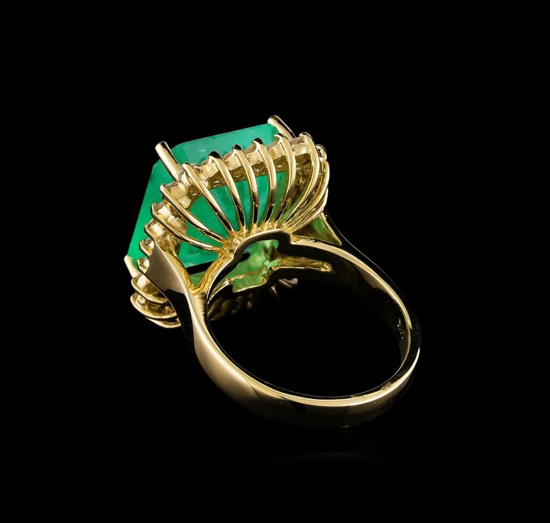 One electronically tested 14KT yellow gold lady's cast fashion ring with a basket halo with a bright polish finish. The featured lady's ring has a shank measuring 2.95 millimeters in width. Identified with markings of "14K". Condition is new, good workmanship. Containing: One prong set emerald step cut natural emerald, measuring 14.51 x 12.80 x 8.18mm, (depth est.) approximate weight of 9.93ct., clarity is heavily included, medium light, moderately strong, green color, (GIA G 4/4), cut is good. Transmitting light somewhat diffusely, transparent to translucent. Colored gemstones are presumed to have been subjected to commonly used enhancement processes. Indications of oil residue. Graded in the setting. Twenty-Six prong set round brilliant cut diamonds, measuring 1.95 - 1.90 x 1.20mm (depth est.) approximate total weight of 26 Stones = 0.70ct. Graded in the setting. Clarity: SI-1 to SI-2. Color: H - I. Cut Good. Total Weight of Colored Stones 9.93ct. Total Weight of Diamonds 0.70ct. Total Weight of Ring 8.90gm. GAS Appraised at $17,565.00.