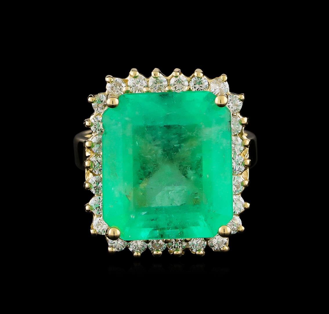 One electronically tested 14KT yellow gold lady's cast fashion ring with a basket halo with a bright polish finish. The featured lady's ring has a shank measuring 2.95 millimeters in width. Identified with markings of "14K". Condition is new, good workmanship. Containing: One prong set emerald step cut natural emerald, measuring 14.51 x 12.80 x 8.18mm, (depth est.) approximate weight of 9.93ct., clarity is heavily included, medium light, moderately strong, green color, (GIA G 4/4), cut is good. Transmitting light somewhat diffusely, transparent to translucent. Colored gemstones are presumed to have been subjected to commonly used enhancement processes. Indications of oil residue. Graded in the setting. Twenty-Six prong set round brilliant cut diamonds, measuring 1.95 - 1.90 x 1.20mm (depth est.) approximate total weight of 26 Stones = 0.70ct. Graded in the setting. Clarity: SI-1 to SI-2. Color: H - I. Cut Good. Total Weight of Colored Stones 9.93ct. Total Weight of Diamonds 0.70ct. Total Weight of Ring 8.90gm. GAS Appraised at $17,565.00.