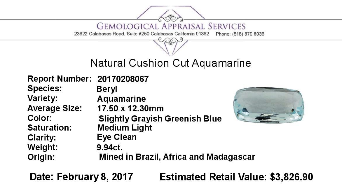 One natural cushion cut aquamarine with an exact weight of 9.94ct., clarity is eye clean, slightly grayish greenish blue, medium light. Gemological Appraisals Services estimates the retail value at $3826.9 GAS Appraised.