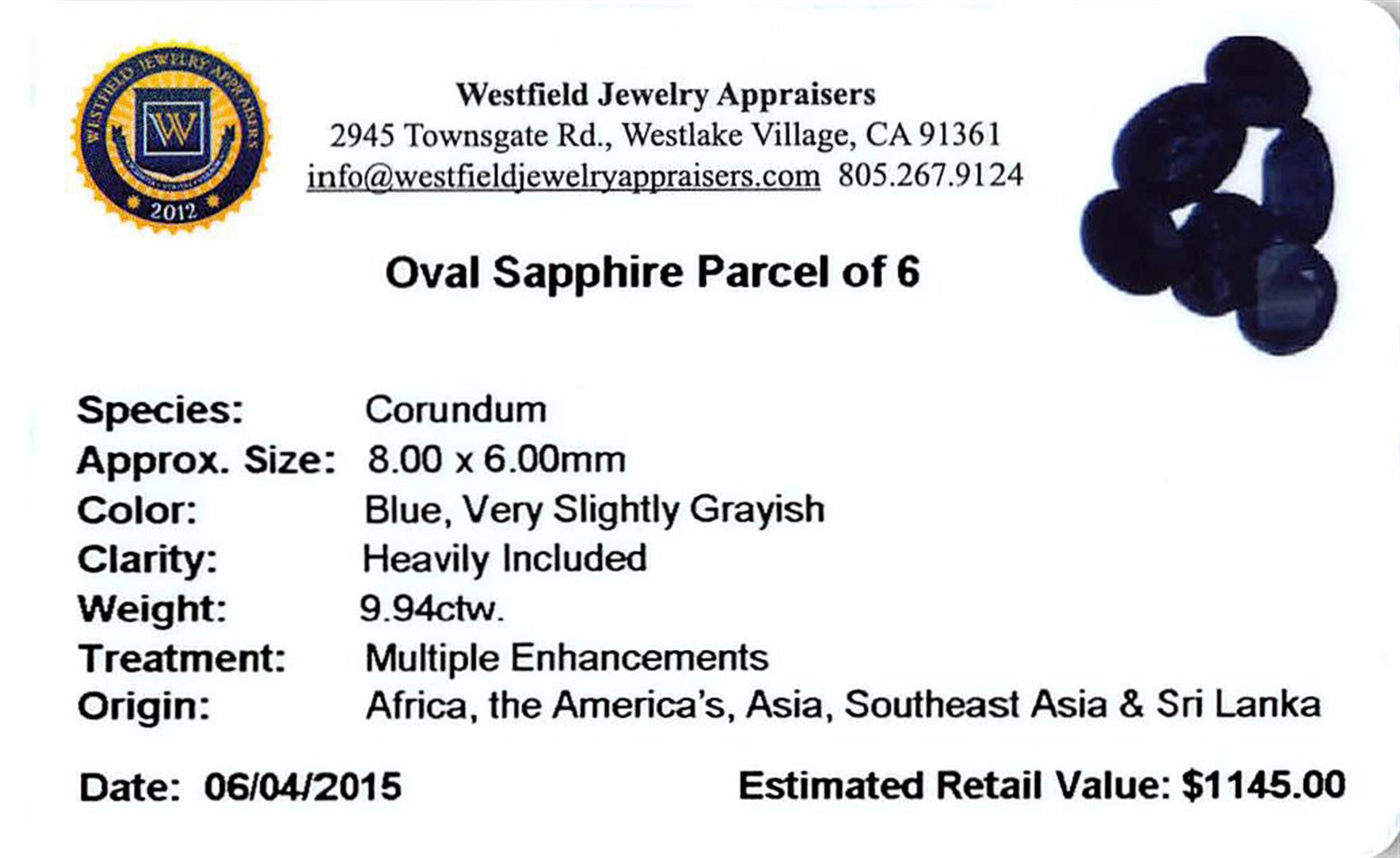 Five oval mixed cut natural blue sapphires, measuring 8.00 x 6.00 x 4.00mm, exact total weight 9.94ct., clarity is heavily included, type II, very dark, very slightly grayish, blue color, (GIA B 8/3), cut is good. Measurements are an average for the group. Transmitting light very diffusely, opaque. Naturally occurring internal & external characteristics are present. Indications of multiple laboratory enhancements, including lattice diffusion. Westfield Appraised at $1,145.00.