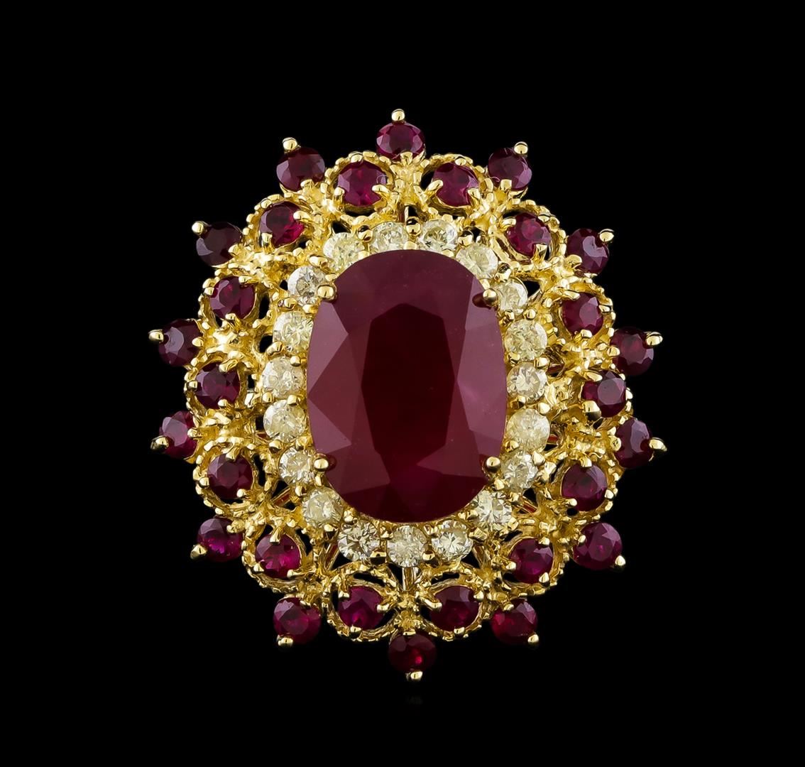 Fourteen karat (14K) yellow gold ruby and diamond ring. An oval cut ruby corundum gemstone is prong mounted in the center of the ring. Round brilliant cut diamonds and ruby corundum gemstones accent the ring around the center gemstone. The ring is cast stamped "14K" and has a gross weight of 9.5 grams. Diamond(s): Shape: Round brilliant cut. Weight: 0.69 carat (19pcs). Average clarity: I1-I2. Average color H-J. Symmetry: Very good. Polish: Very good. Gemstone(s): Gemstone: Ruby corundum. Nature: Natural. Shape: Oval and round, faceted. Quantity: 29 mounted (1 Center and 28 side stones). Weight: 9.94 carats total. Center stone dimensions: Length-13.35 mm. ; Width-9.76 mm. Bulge: Visible. Clarity: SI, type 3. Color: Red (5/5). Symmetry: Very good. Color intensity: Medium. Transparency: Transparent. Tone: Dark. Enhancements: Indications of high temperature heat treatment, with glass and flux additives. Metal(s): Metal: Gold, stamped. Purity: 14K. color: Yellow. Condition: Excellent. Finish: High polish. GGA Appraised at $6,480.00.