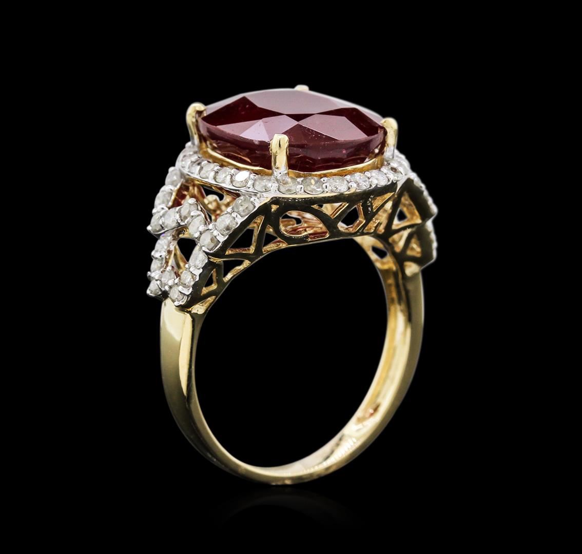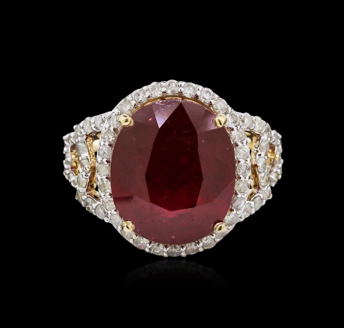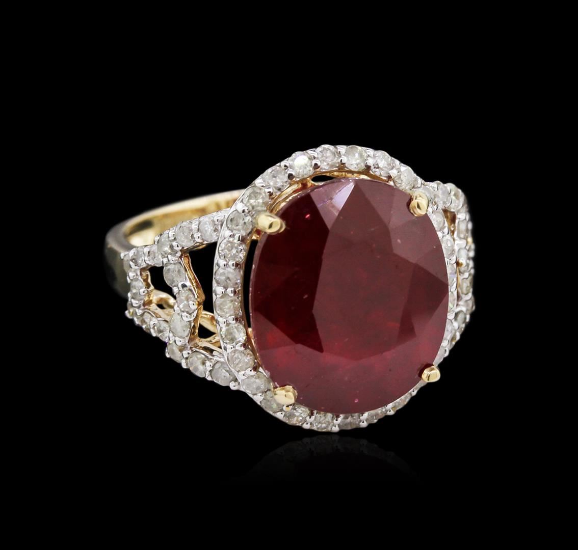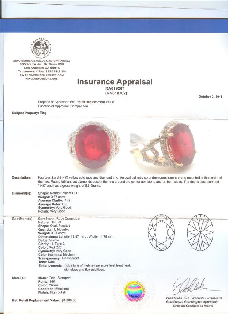 Fourteen karat (14K) yellow gold ruby and diamond ring. An oval cut ruby corundum gemstone is prong mounted in the center of the ring. Round brilliant cut diamonds accent the ring around the center gemstone and on both sides. The ring is cast stamped "14K" and has a gross weight of 5.6 Grams. Diamond(s): Shape: Round Brilliant Cut. Weight: 0.87 carat. Average Clarity: I1-I2. Average Color: H-J. Symmetry: Very Good. Polish: Very Good. GemStone(s): Ruby Corundum. Nature: Natural. Shape: Oval, Faceted. Quantity: 1. Weight: 9.94 carat total. Dimensions: Length- 13.87 mm. ; Width 11.78 mm. Bulge: Visible. Clarity: I1, Type 3. Color: Red (5/5). Symmetry: Very Good. Color Intensity: Medium. Transparency: Transparent. Tone: Dark. Enhancements: Indications of high temperature heat treatment, with glass and flux additives. Metal(s): Metal: Gold, Stamped. Purity: 14K. Color: Yellow. Condition: Excellent. Finish: High polish. GGA Appraised at $4,880.00.