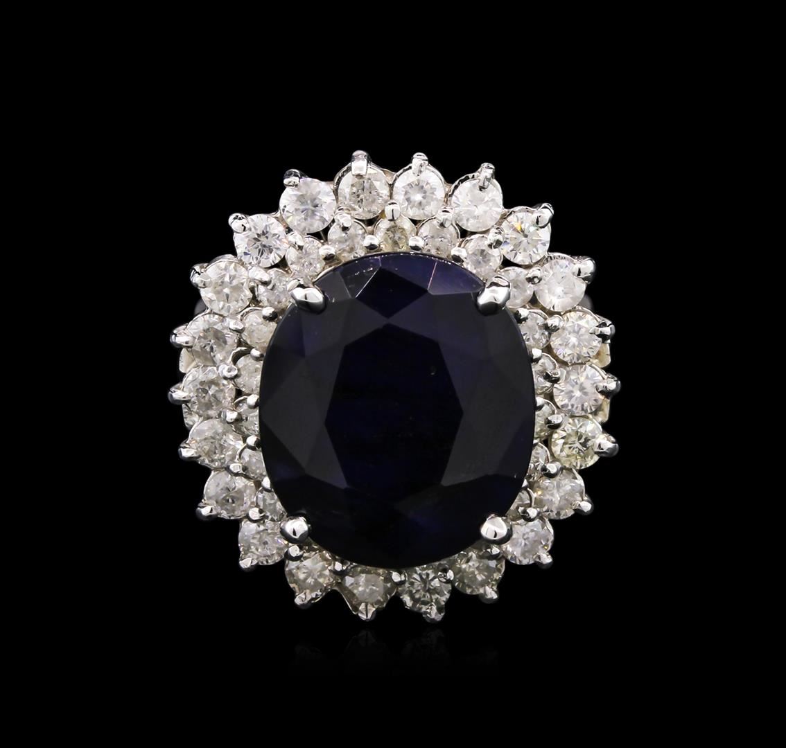 One electronically tested white gold ladies cast sapphire and diamond ring with a bright polish finish. Condition is new, good workmanship. The featured sapphire is set within a tiered diamond bezel, completed by a two millimeter wide band. Identified with markings of "K14". Containing: One prong set oval mixed cut natural blue sapphire, measuring 13.90 x 11.80 x 6.70mm, 12% bulge factor, approximate weight of 9.99ct., type II, dark, moderately strong, violetish blue color, (GIA vB 7/4), cut is good. Transmitting light very diffusely, opaque. Naturally occurring internal & external characteristics are present. Indications of multiple laboratory enhancements, including high temperature diffusion treatment. Graded in the setting. Forty-four prong set round brilliant cut diamonds approximate total weight of 44 Stones = 1.50ct. Graded in the setting. Clarity: I-1 to I-2.Color: H - J. AIG Appraised at $5,255.00.