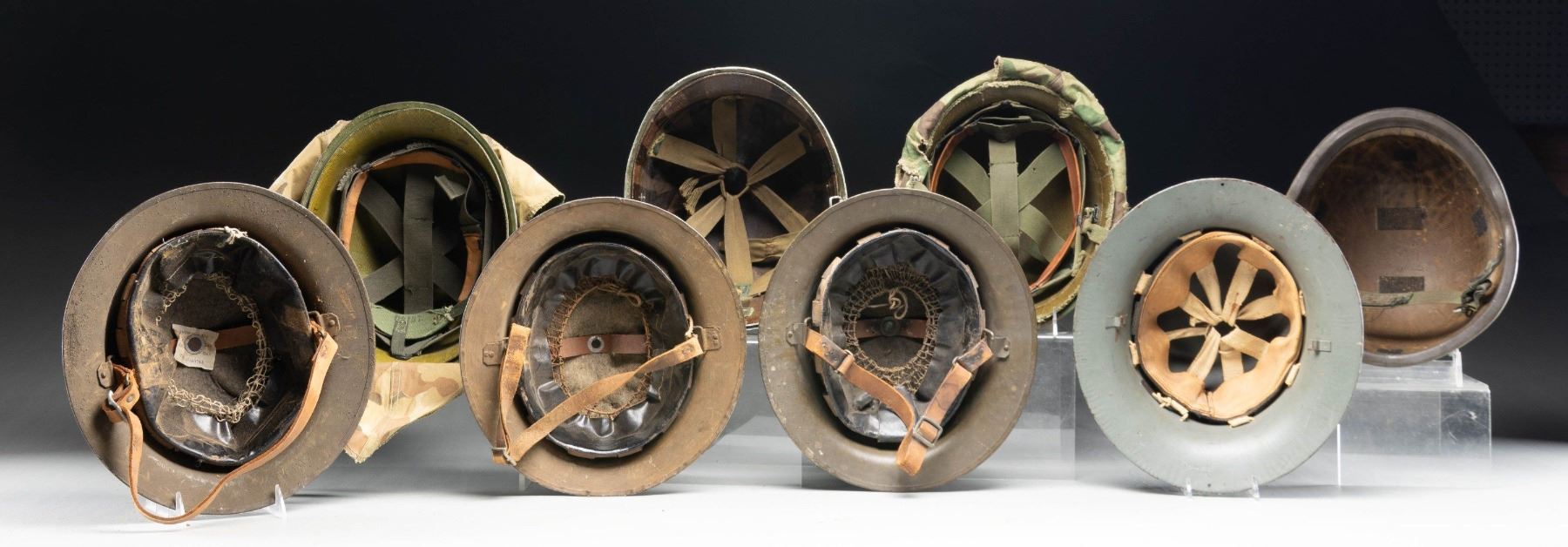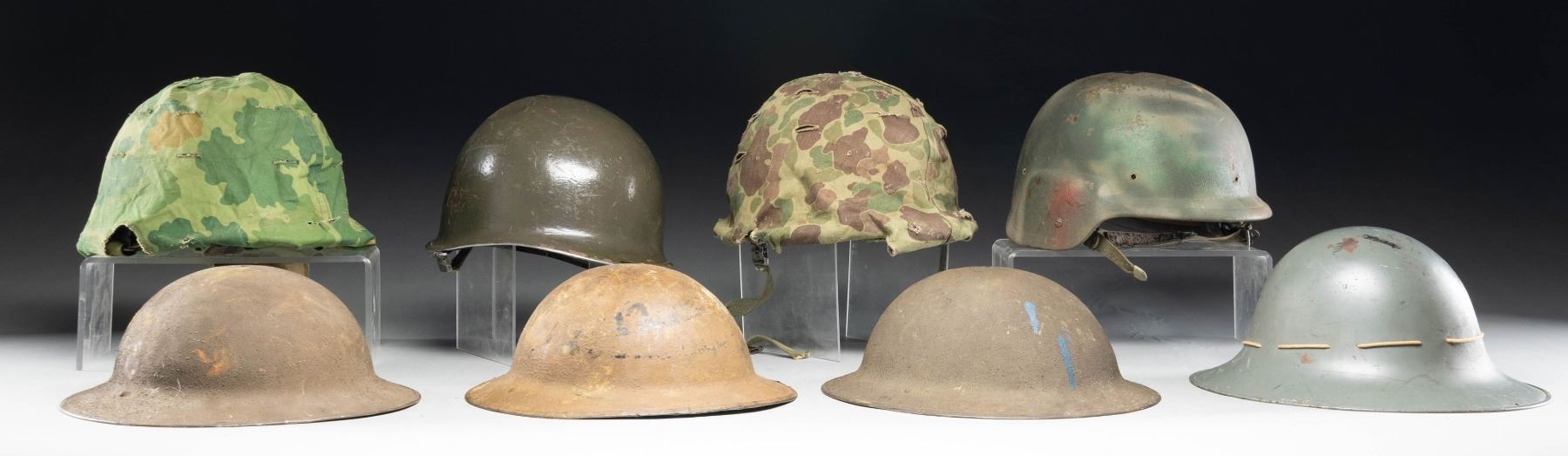 This helmet lot includes 1 seldom seen British Zuckerman helmet with full original liner but no chinstrap. / 3 WWI era US M1917 helmets with full liners and chinstraps. / 1 WWII US front seam swivel bail helmet with correct partial liner and chinstrap. / 2 Post WWII US rear seam helmets with correct liners, chinstraps, and camouflage covers. / 1 Modern US composite helmet with chinstrap but no liner. CONDITION: all helmets generally show light wear. The US front seam helmet shows moderate wear. (02-24145/BF). NON-GUN. $400-600.