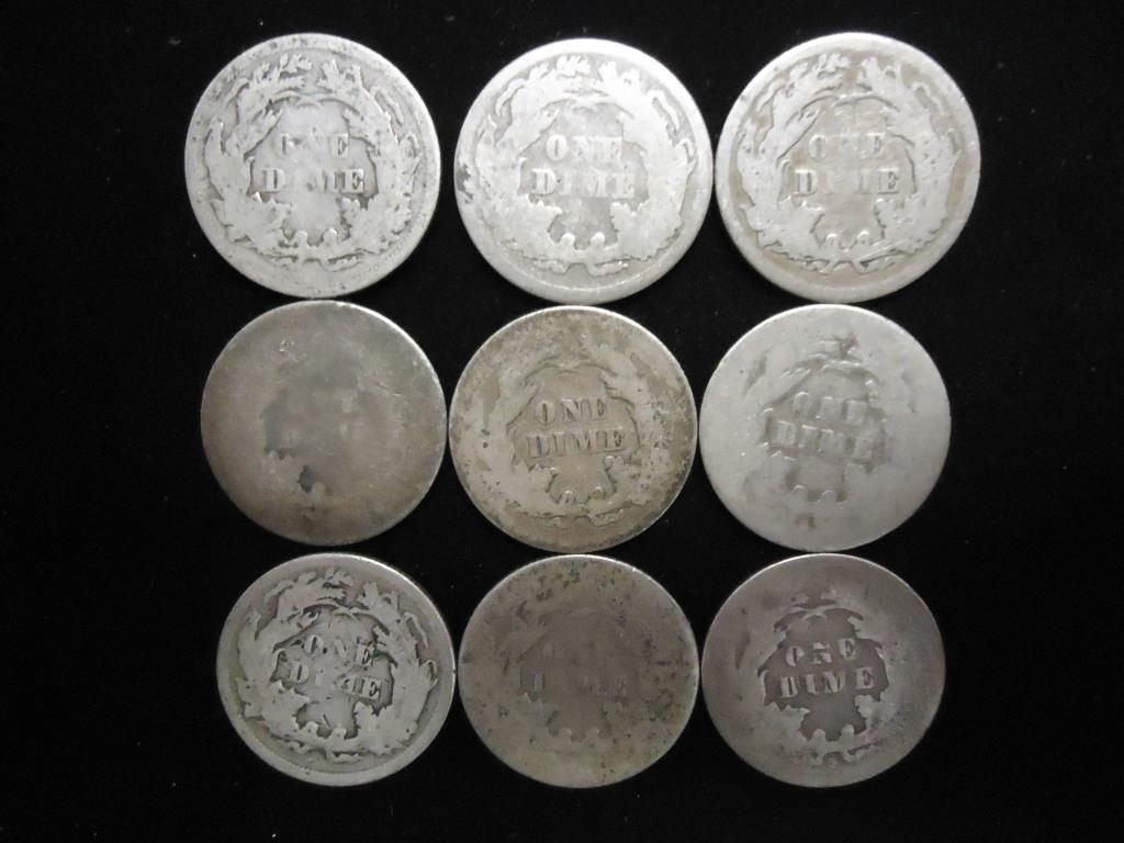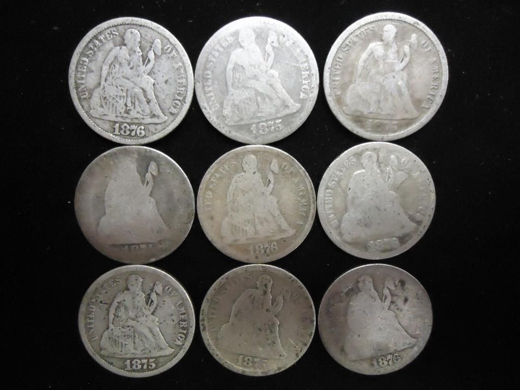 9 ASSORTED 1870'S SEATED LIBERTY DIMES