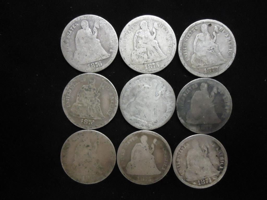 9 ASSORTED 1870'S SEATED LIBERTY DIMES