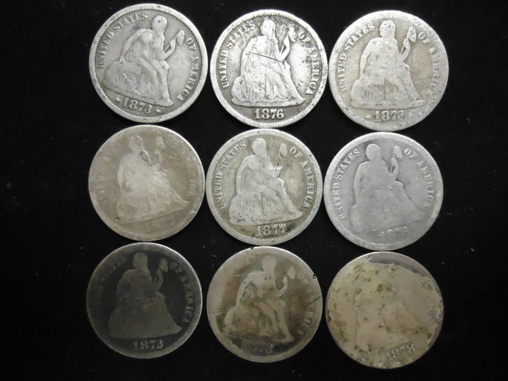 9 ASSORTED 1870'S SEATED LIBERTY DIMES