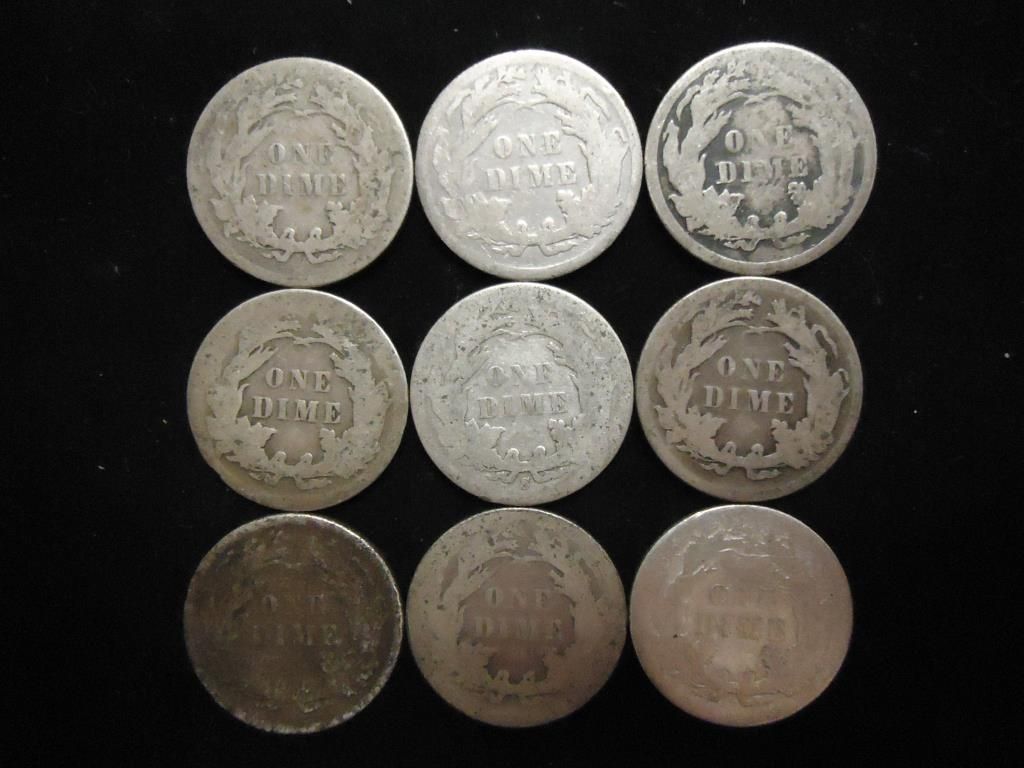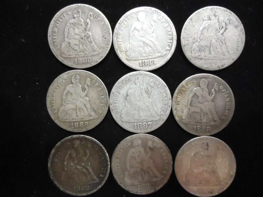 9 ASSORTED 1880'S SEATED LIBERTY DIMES