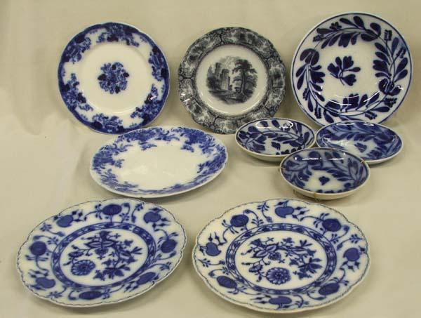 9 Antique Flow Blue Plates. Largest plate measures approx. 8 3/4'' circumference. Buyers Pay Actual Shipping and Handling Charges(see terms and conditions for more information).