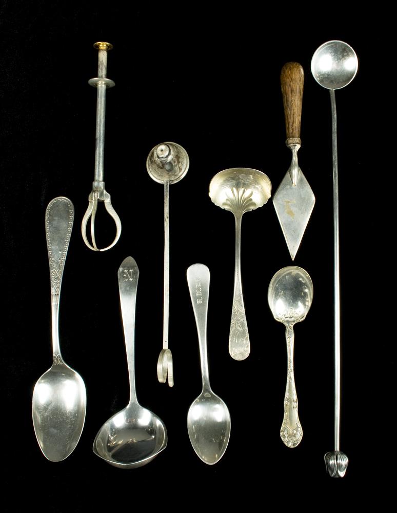 Includes a Sterling and gold wash ladle, 5.75" L. A Sterling, gold wash and enamel Swedish sugar tong, (possibly David Anderson), 6.75" L. A Randahl Sterling candle snuffer, 7.75" L. A Thomas Long Co. Sterling ladle, 6.25" L. A Sterling iced tea spoon, 13.25" L. Two stainless steel spoons, a Silver Plated sugar spoon and a Silver Plated and wood handled trowel. 7.1 oz. Sterling weight.