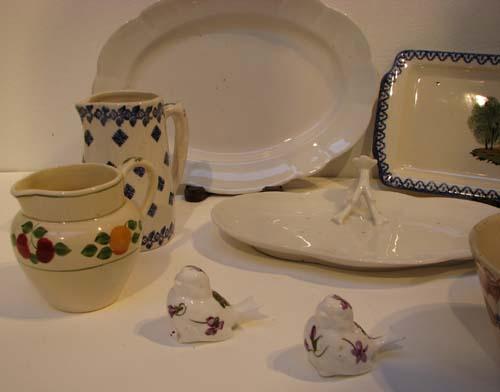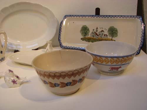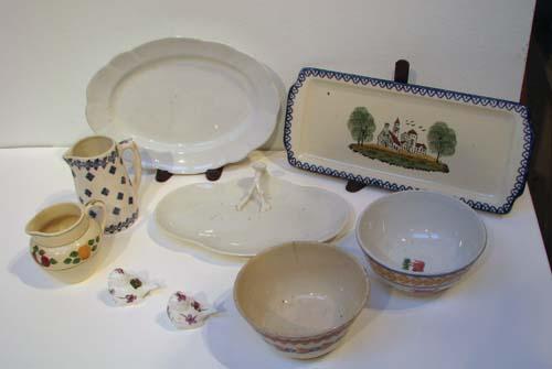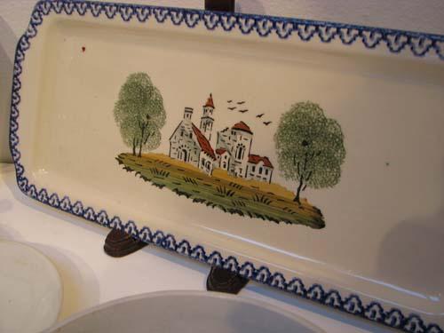 Title: 9 Assorted Ceramics including Titianware Creamer, rectangular serving tray with painted church decoration, small jug, 2 bowls, 2 serving platters (one with small handle), pig salt and pepper