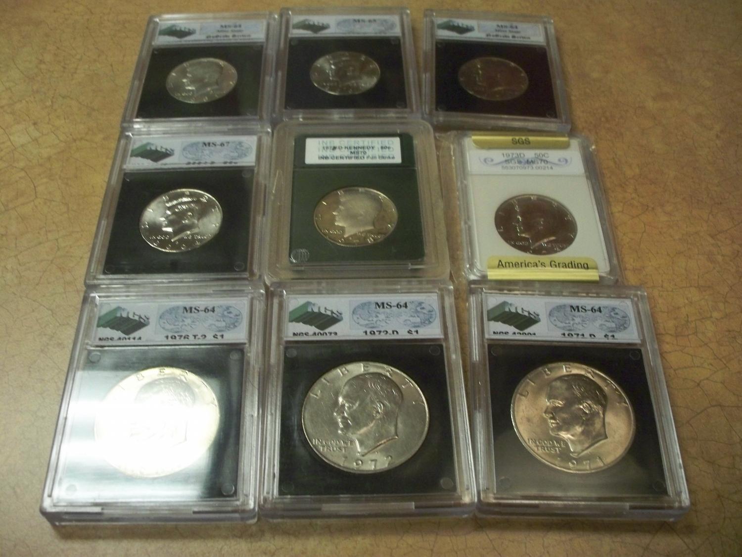 9 Assorted Graded Half Dollar Kennedy's and $1 Eisenhowers, MS-64,MS67