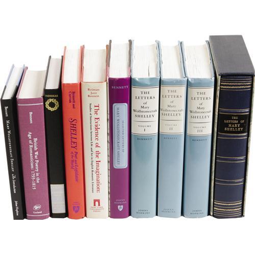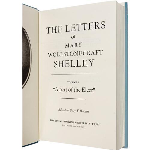 <B>Nine Betty Bennett Books Relating to Mary Shelley.</B></I> Betty T. Bennett, editor, <I>The Letters of Mary Wollstonecraft Shelley</B></I> (Baltimore: Johns Hopkins University Press, 1980), baby blue cloth with gilt lettering on spine and front board, 8vo (6.5" x 9.5"), dust jackets. Three volumes, Volume I: 591 page with index, Volume II: 360 pages with index, Volume III: 473 pages with index. The books are in very good condition, with minor edge and corner wear, also to the dust jacket. Minor wrinkling to the head and tail of the spines.<BR><BR>Betty T. Bennett: <I>Mary Wollstonecraft Shelley: An Introduction</B></I> (Baltimore: Johns Hopkins University Press, 1996), 177 pages with index, black half-cloth with silver lettering on spine and front board, 8vo (5.75" x 8.25"). Fine condition.<BR><BR>Betty T. Bennett, Donald H. Reiman, Michael C. Jaye, editors: <I>The Evidence of the Imagination.</B></I> (New York: New York University Press, 1978), 409 pages with index, red cloth with gilt lettering on spine and front board, 8vo (6.25" x 9.25"), dust jacket. Minor edge wear does not detract from this gorgeous book.<BR><BR>Betty T. Bennett, editor: <I>Lives of the Great Romantics Volume 3</B></I> (London: Pickering & Chatto, 1999), 206 pages with index, black cloth binding with gilt lettering on the spine, 8vo (5.5" x 8.75"), Fine.<BR><BR>Betty T. Bennett, editor: <I>Selected Letters of Mary Wollstonecraft Shelley</B></I> (Baltimore: Johns Hopkins University Press, 1995), 391 pages with index, pink half-cloth with brown cloth boards and gilt lettering on spine, 8vo (6.5" x 9.5"), dust jacket. Fine, with only minor edge wear to the edges of the dust jacket.<BR><BR>Betty T. Bennett, Bennett, editor: <I>British War Poetry in the Age of Romanticism: 1793-1815.</B></I> (New York: Garland, 1976), 528 pages with index, purple cloth with white lettering on spine, 8vo (5" x 8.25"). The tail of spine is bumped, and minor corner wear, else fine.<BR><BR>Betty T. Bennett, Stuart Curran, editors: <I>Shelley: Poet and Legislator of the World</B></I> (Baltimore: Johns Hopkins University Press, 1996), 310 pages with notes, orange cloth with purple lettering on spine and front board, 8vo (6" x 9.25"). Very minor soiling on back board, else fine.<BR><BR>Betty T. Bennett: <I>The Letters of Mary Shelley: Volume I "A Part of the Elect"</B></I> (Baltimore: Johns Hopkins University Press, 1980), 591 pages, full dark blue banded leather with gilt lettering on spine and marbled endpapers, tipped-in facsimile of letter on back free endpaper. Comes housed in slipcase, which is covered in marbled paper matching the endpapers in the book, and an oval picture of Mary Shelley. Fine condition, with no noticeable wear present. <I>From the Betty Bennett Collection.</B></I><BR><BR><b>Shipping:</b> Books & Catalogs (<a target="_blank" href="http://www.heritageauctions.com/common/shipping.php">view shipping information</a>)