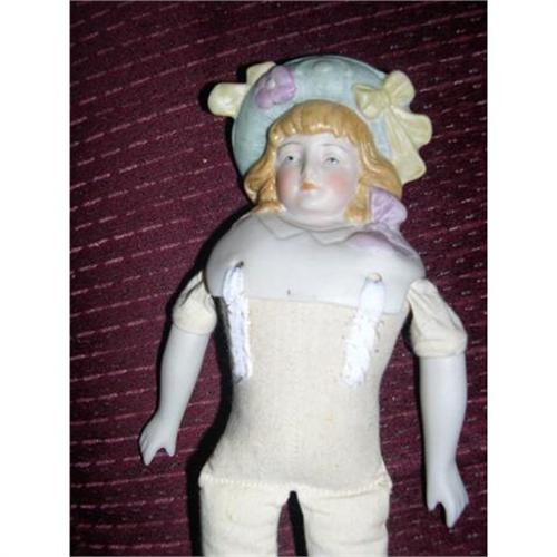 9" Bisque Bonnet Head Doll marked RMB. I'm not sure when this was made but it's a new head, not the old German kind. It's on a newer body and looks nice. She has flat feet with yellow paitned boots. I see no damage to her. If you like to dress dolls, she will be cute when you finish her. Doll comes from a smoke free environment. Buyer to pay 10.00 shipping, handling, and insurance. Thanks for viewing.