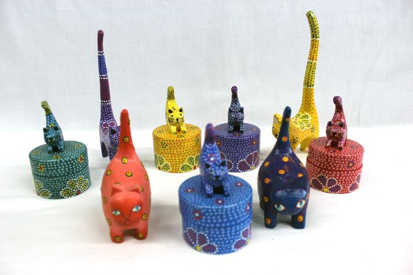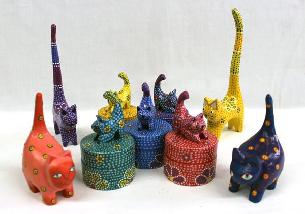 9 Blainese Hand Painted Wooden Cats. 4 cat ring holders and 5 cat ring boxes. Fat Cat 4 3/4"H, Tall Cat 8 1/4"H. Box Cat 4 1/4"H.