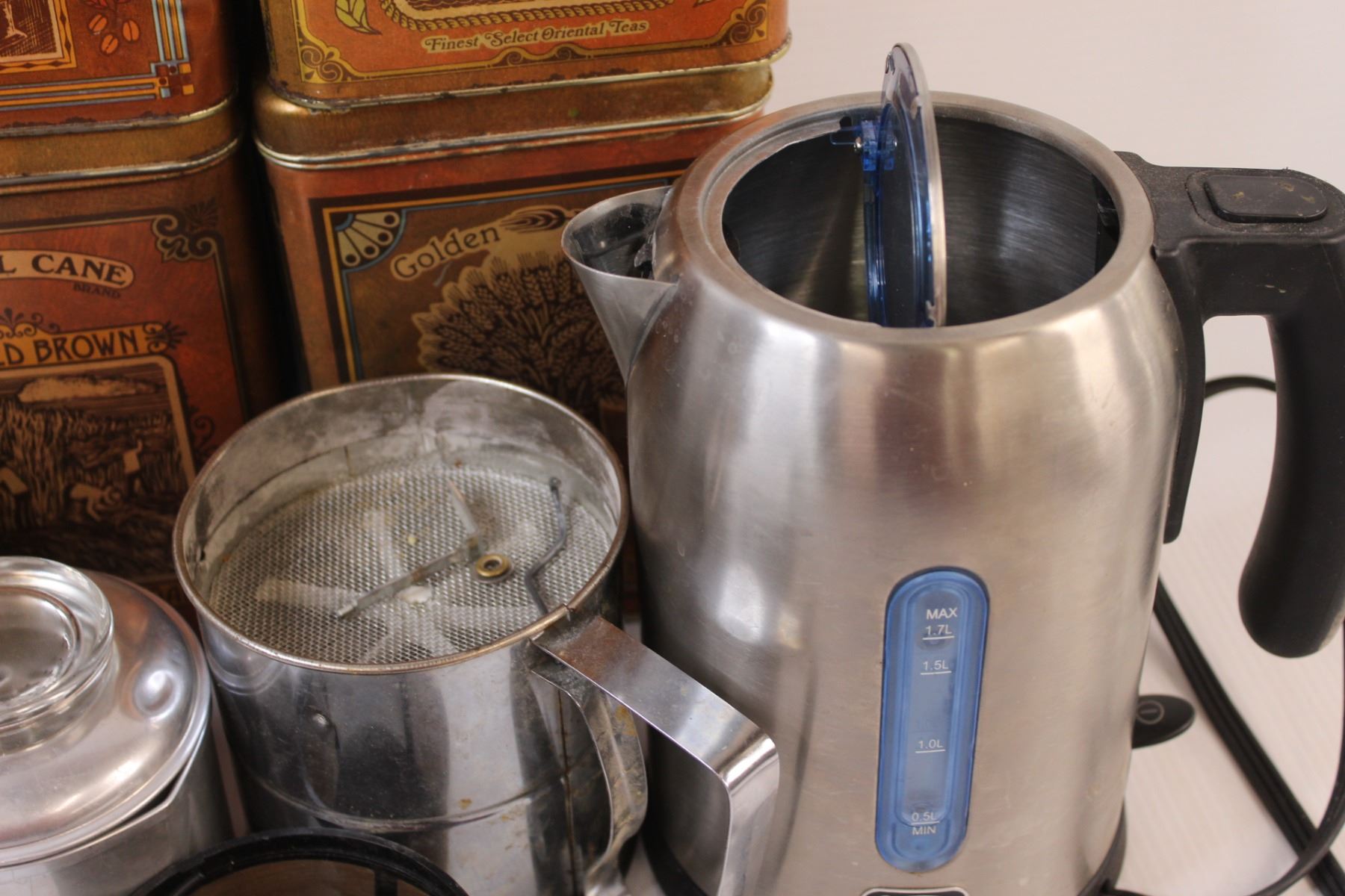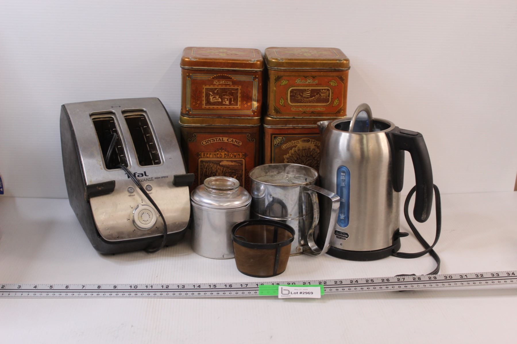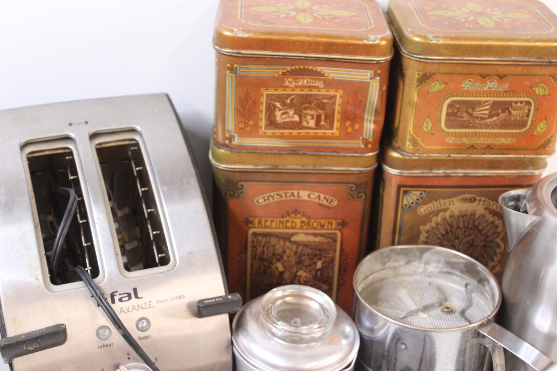(9) Box Lot of Used Kitchenware: Tin Cannisters: Toaster; Sifter; Coffee Maker & Misc.