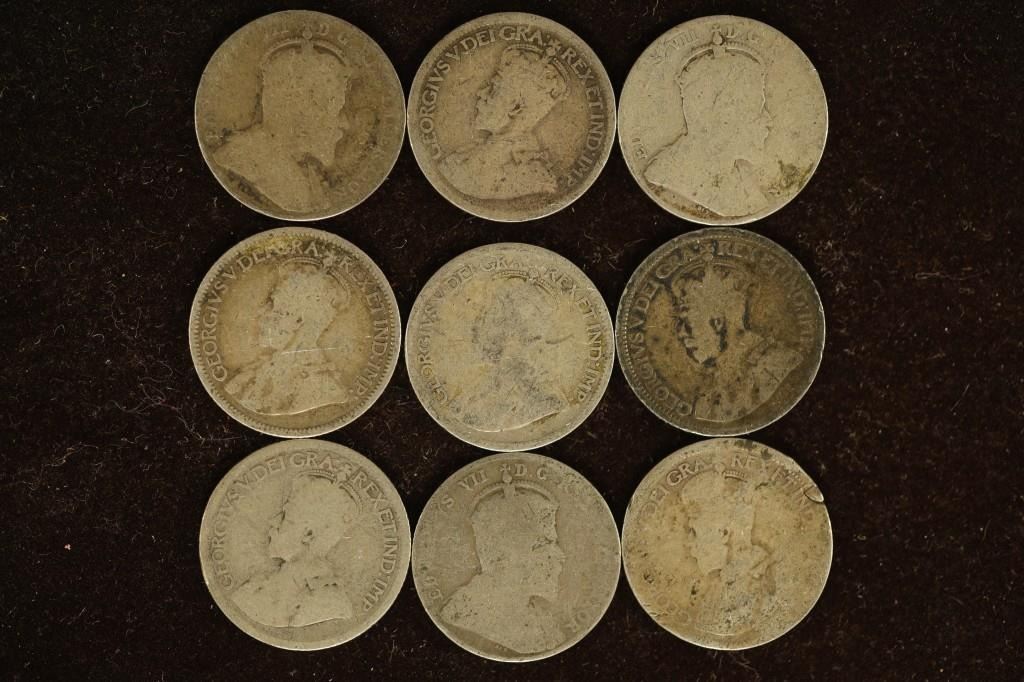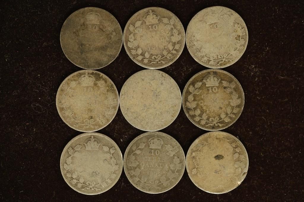 9 CANADA SILVER 10 CENT COINS: 1902, 1909, 1910,