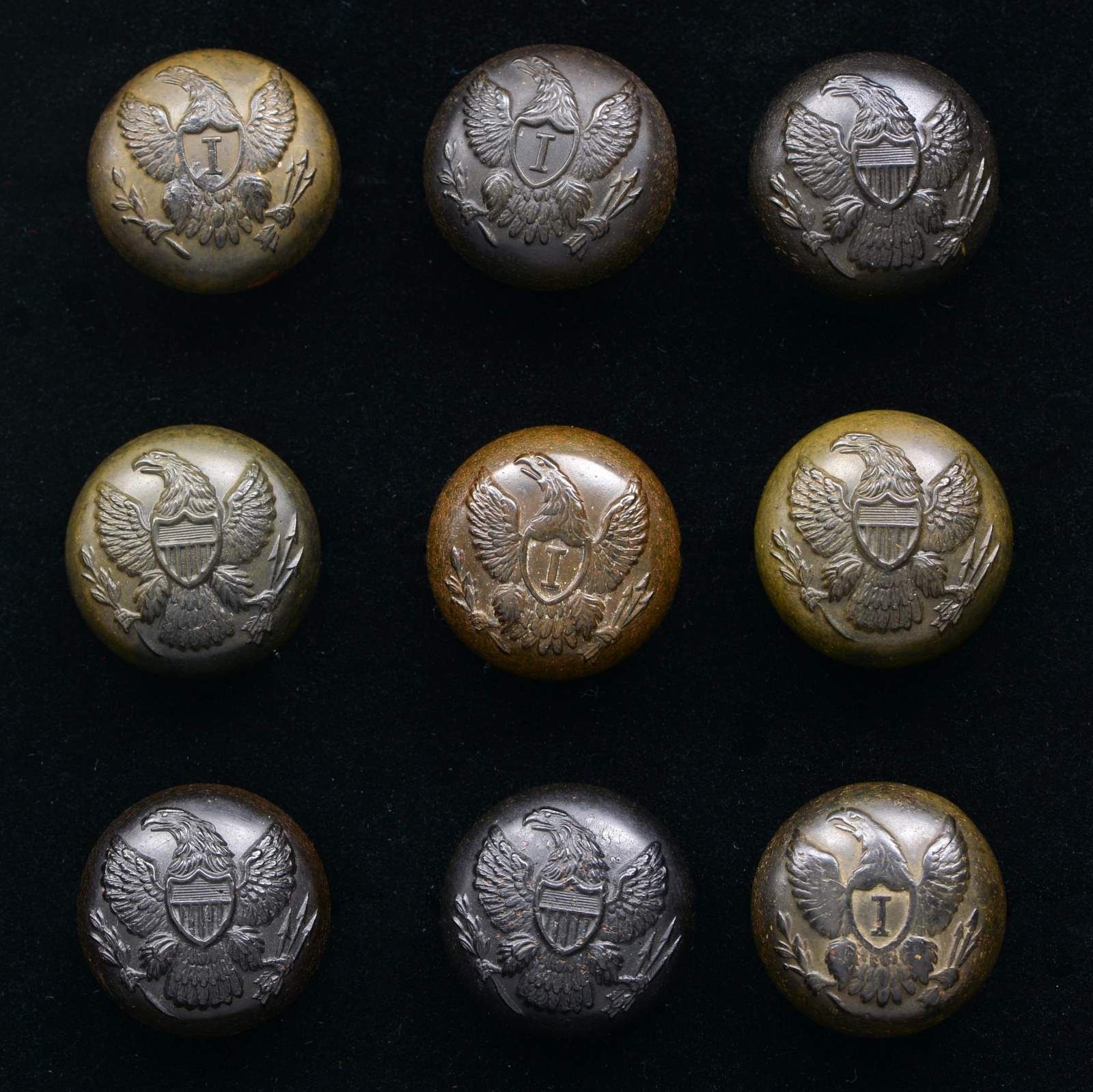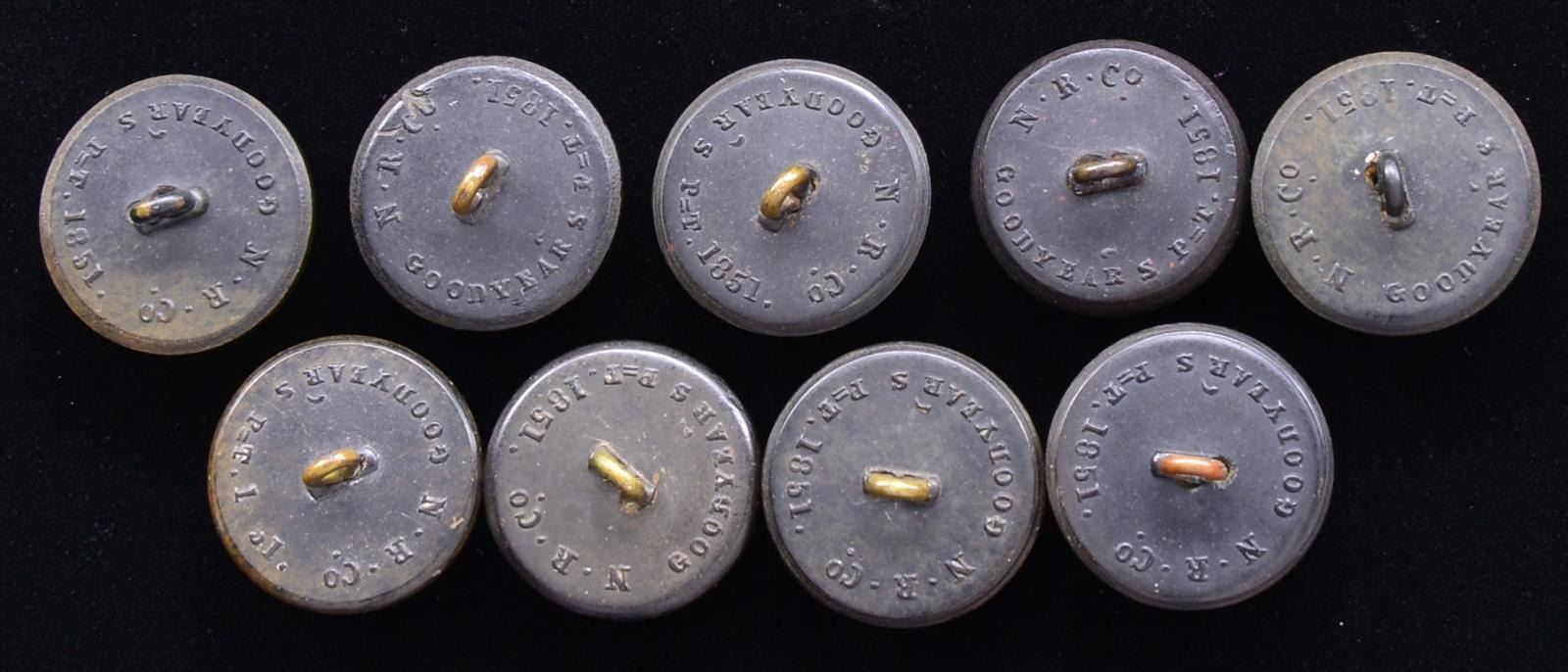 1) 5 Examples of Civil War period enlisted, hard rubber, eagle buttons generally worn by enlisted members of sharpshooter units. Albert # GI-95-A1. Faces depict a spread winged eagle w/ a Federal shield on the chest. The reverses are marked, “N.R.CO. GOODYEAR’S P=T. 1851. “. Full straight shanks.