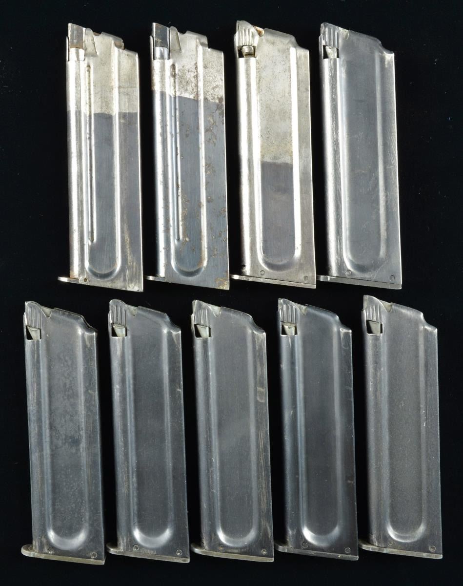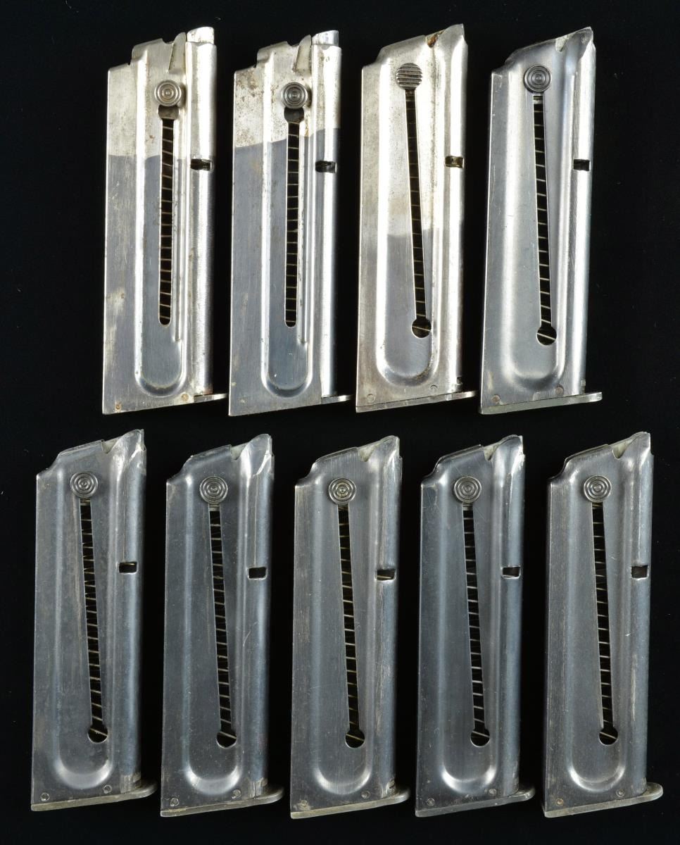 Condition of all factory original mags. is slight variation of very good. 1 Ace additionally marked "SERVICE MODEL" having grooved follower button & machined steel follower. / 2 Ace marked w/ formed metal followers & 2 toned bodies. / 6 Conversion style w/ aluminum followers. (02-16951-6/NW). $500-750.