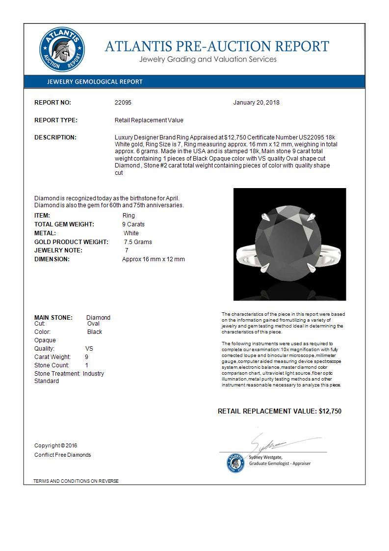 REF-210W4F -22095 ---- 9 CTW Black VS/SI Diamond Designer Engagement Ring 18K White Gold ---- Luxury Designer Brand Ring Appraised at $12,750 Certificate Number US22095 18k White gold, Ring Size is 7, Ring measuring approx. 16 mm x 12 mm, weighing in total approx. 6 grams. Made in the USA and is stamped 18k, Main stone 9 carat total weight containing 1 pieces of Black Opaque color with VS quality Oval shape cut Diamond , Stone #2 carat total weight containing pieces of color with quality shape cut