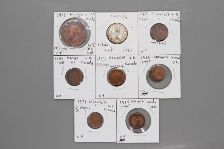 1967 1 cent XF, 1942 1 penny XF, 1940 1 cent a.u., 1935 1 cent VF, 1961 silver 25 cent, 1935 1 cent VF, 1971 1/2 penny XF, 1918 1 penny VF