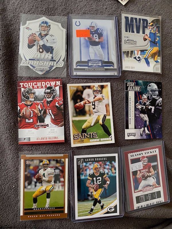 9 Card Football QB and TE lot Drew Brees, Aaron Rodgers, Favre, Mayfield, Gronkowski