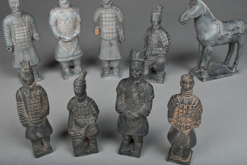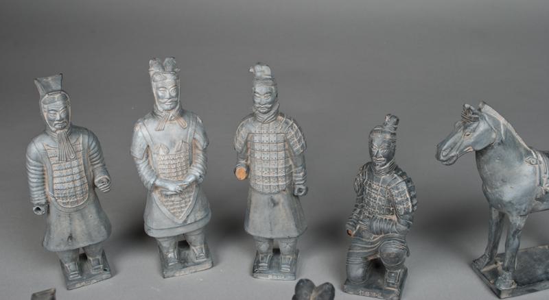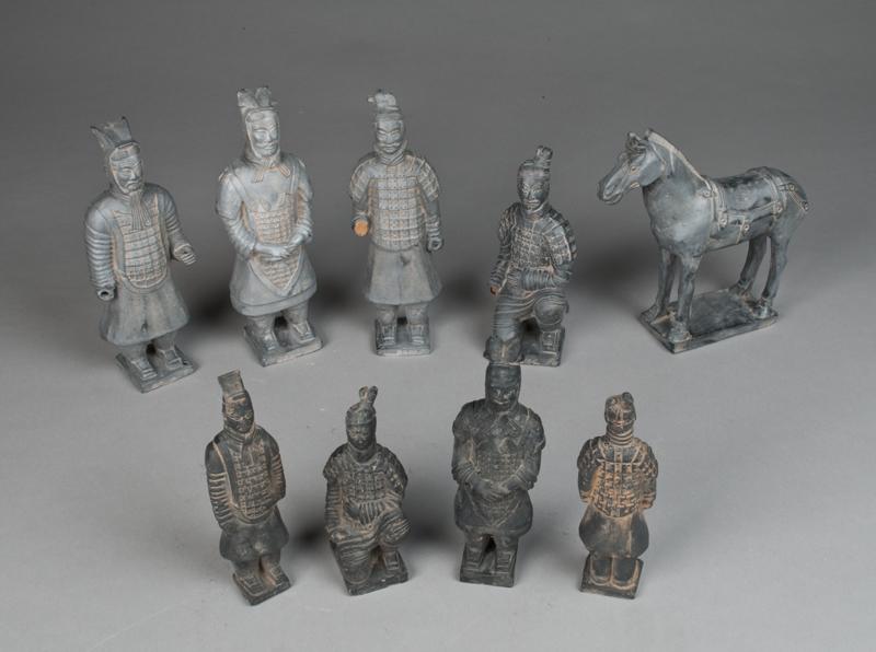 Finely molded to depict warriors and a horse. Tallest 8.5" H, circa 20th century.