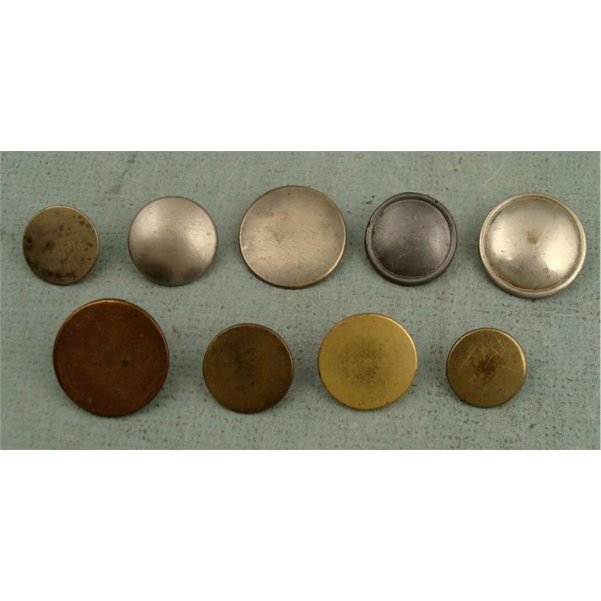 9 U.S. Colonial Era Coat Buttons in both flat and rounded styles. * Composition: Pewter and gold colored, and some with brass shanksDiameter: 3/4" to 1"Markings: ROGERS PEET & CO., NY, WARRANTED ORANGE, FINE GOLD COLOUR, W. DOWLER BIRMINGHAM, LONDON (other name obscurred)Condition: Very good overall- one missing shank
