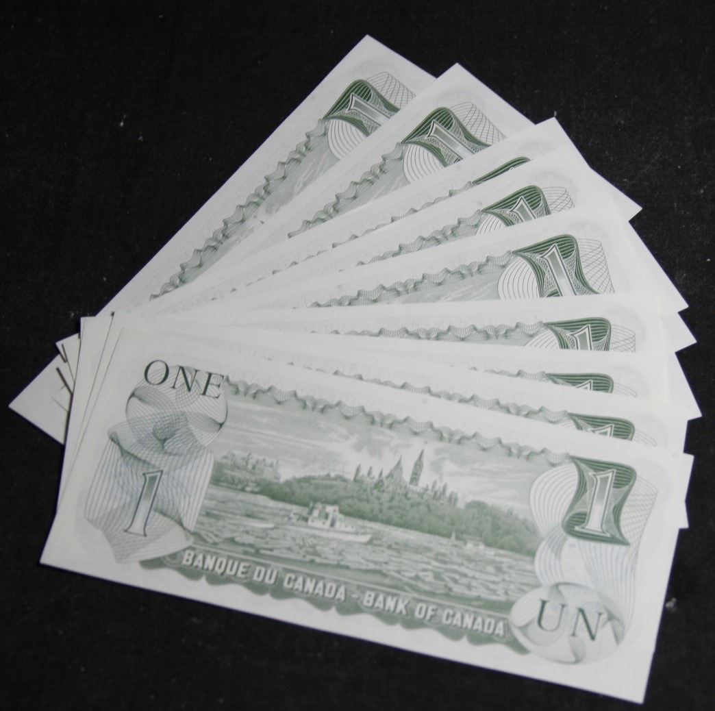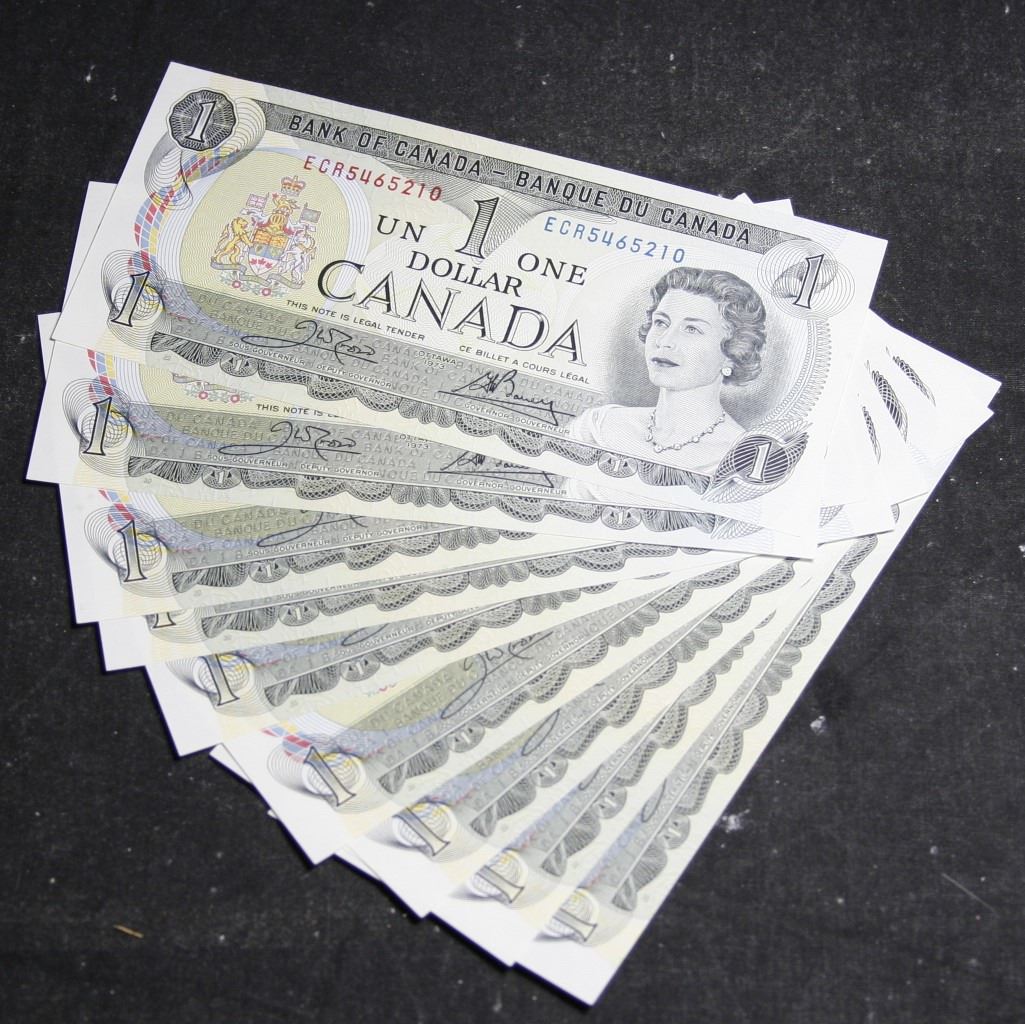9 Consecutive 1973 Bank of Canada $1 Bank Notes - All Uncircualted