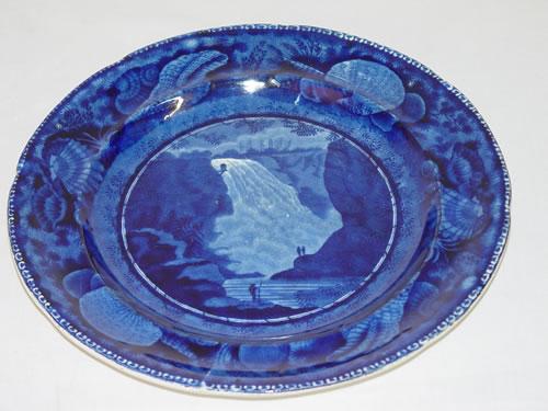 9" DARK BLUE STAFFORDSHIRE PLATE "FALL OF MONT MORENCI NEAR QUEBEC" W/ E. PLURIBUS UNUM EAGLE & SHELL BORDER - LIGHT WEAR & IMPERFECTIONS