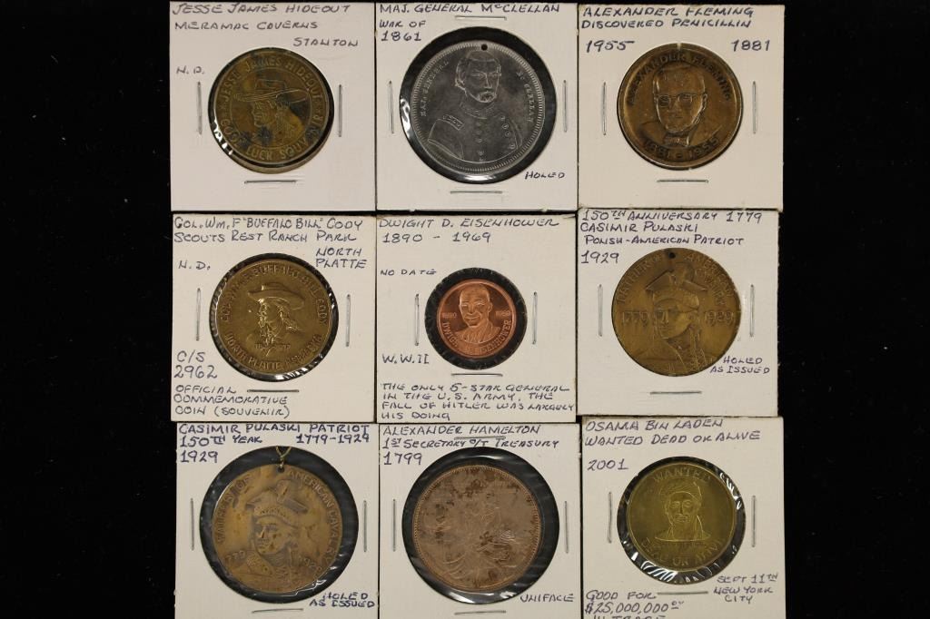 HIDEOUT, MAJOR GENERAL MCCLELLAN, ALEXANDER FLEMING, BUFFALO BILL CODY, DWIGHT EISENHOWER, 2-CASIMIR PULASKI(ONE HAS HOLE), ALEXANDER HAMILTON AND NEW YORK CITY TOKEN WANTED DEAS OR ALIVE OSAMA BIN LADEN.