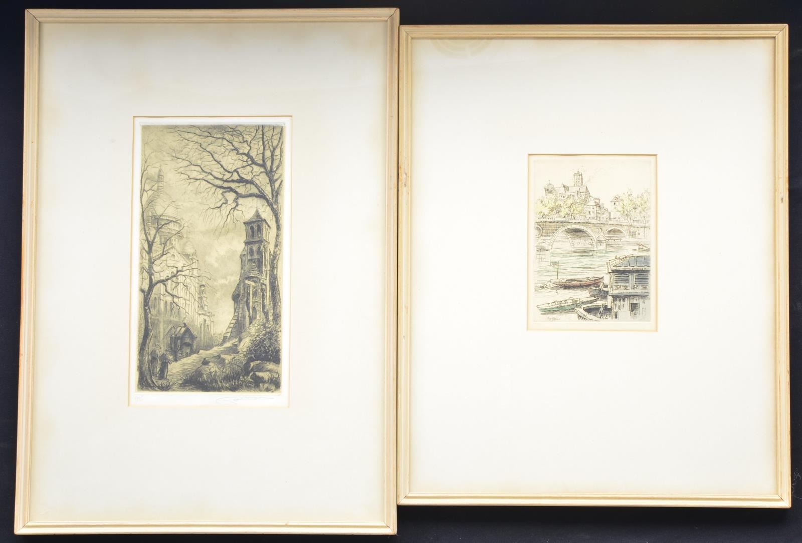 Framed engraving feature European style city scenes. Framed prints are of dogs. CONDITION: prints have not been removed to examine them. Good overall appearance w/ wear & tears to paper backs. PROVENANCE: From the Collection of Thomas B. & Freeda Harper Jr. (02-16561/MD). $250-500.