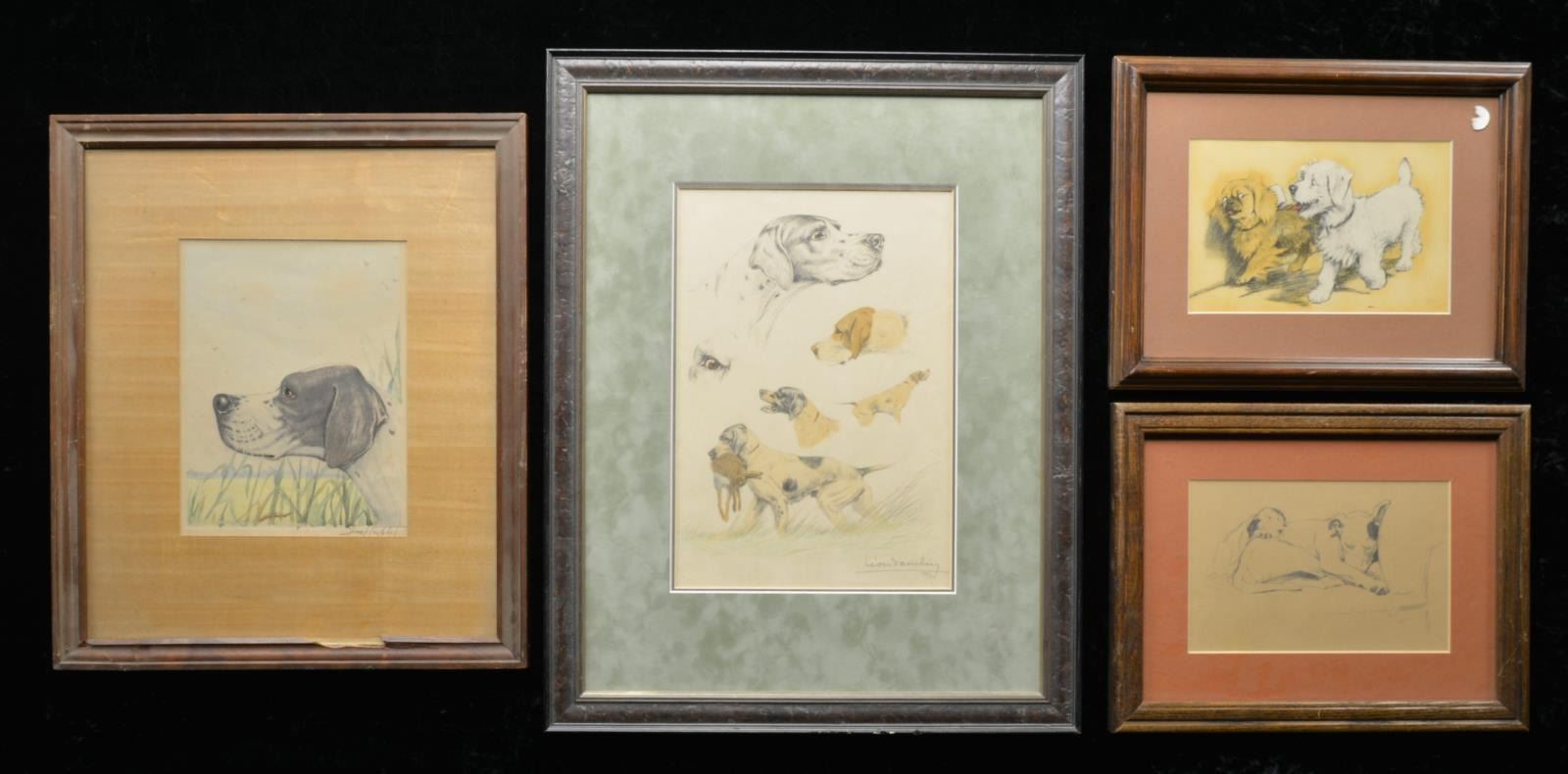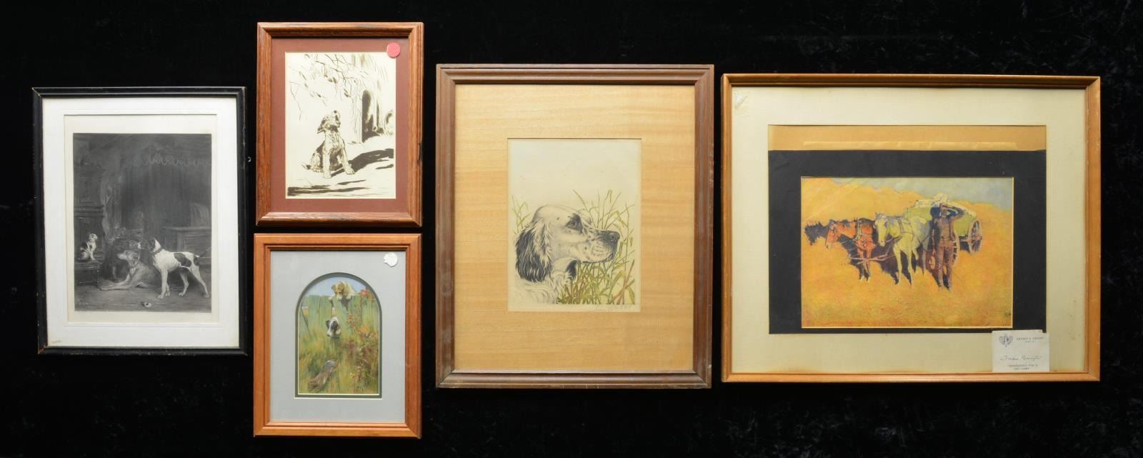 Prints primarily of dogs. Frames range from 21.5" x 17" to 11" x 6". Notable example is Artist proof of "Benighted for a Dry Camp" by Frederick Remington. CONDITION: Prints have not been removed from frames for inspection, however appearance is very good. Good overall frame condition exhibiting wear; one frame is broken & missing pieces. PROVENANCE: From the Collection of Thomas B. & Freeda Harper Jr. (02-16566/MD). $250-500.