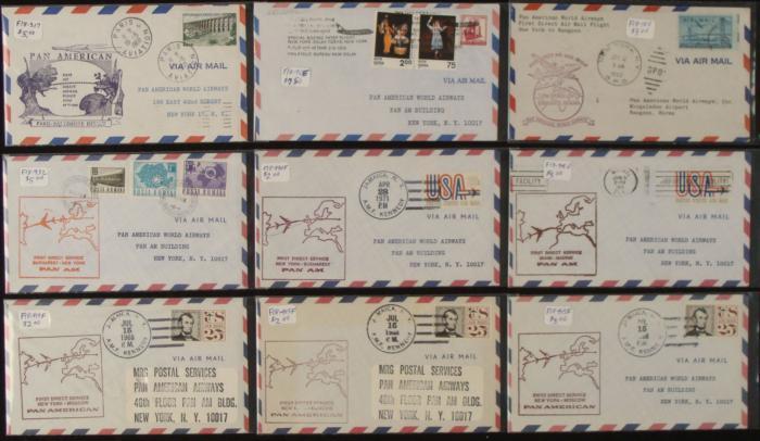 These 9 original covers are all Air Mail, dating from 1968-1976. There are 7 from the First Direct Flights from the U.S. to Moscow, Bucharest, Rangoon, and Madrid. There is one from a Special Boeing 747SP flight from New York to Delhi to Tokyo. All have nice cachets, and post marks. All are in Excellent condition, in individual sleeves with identifying numbers.