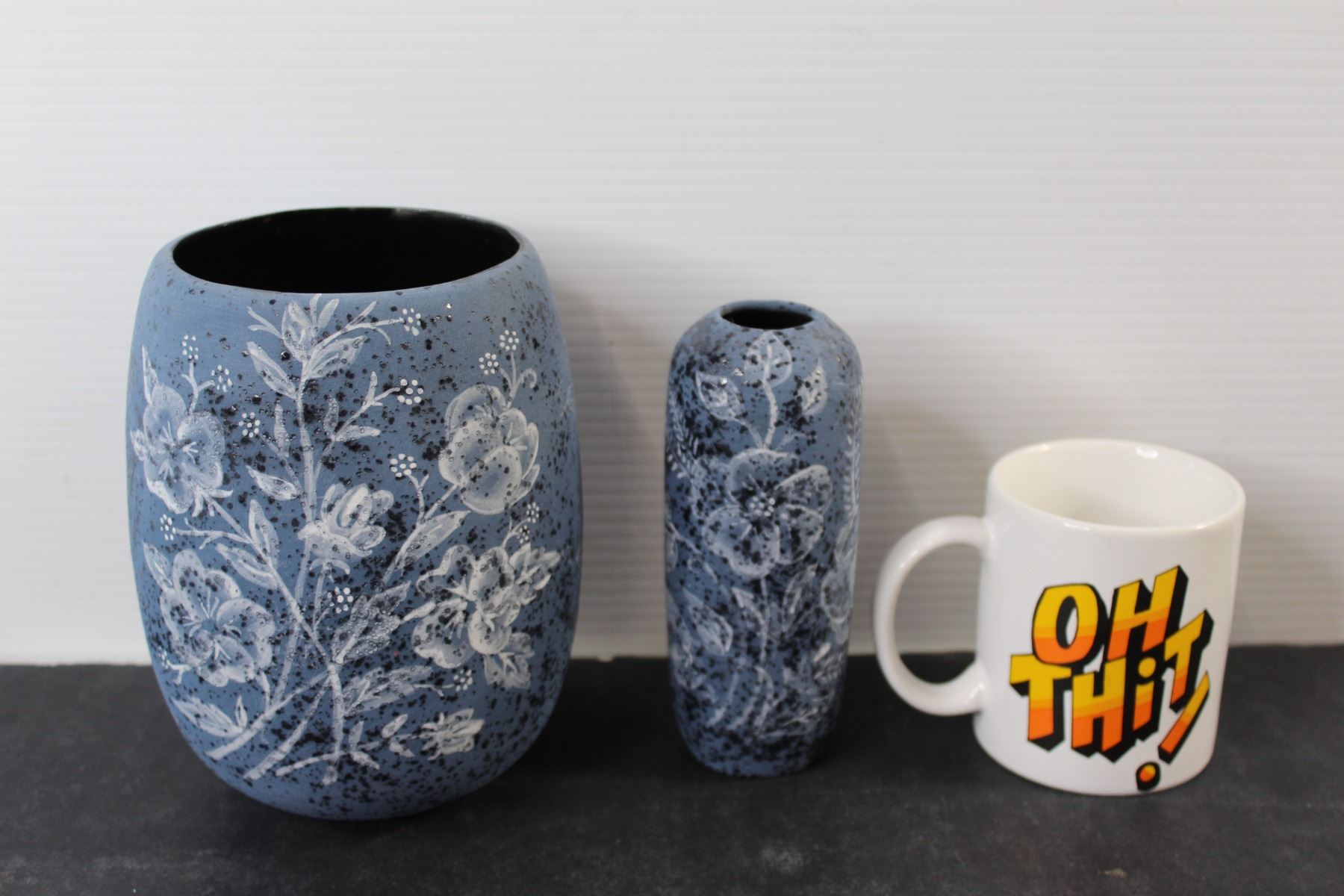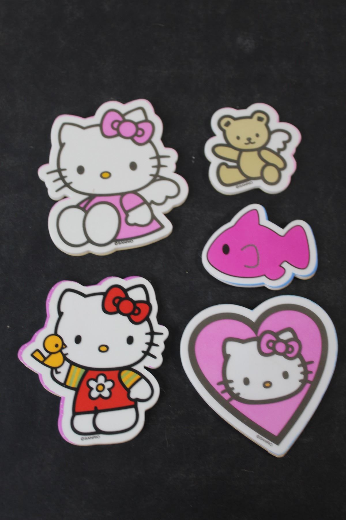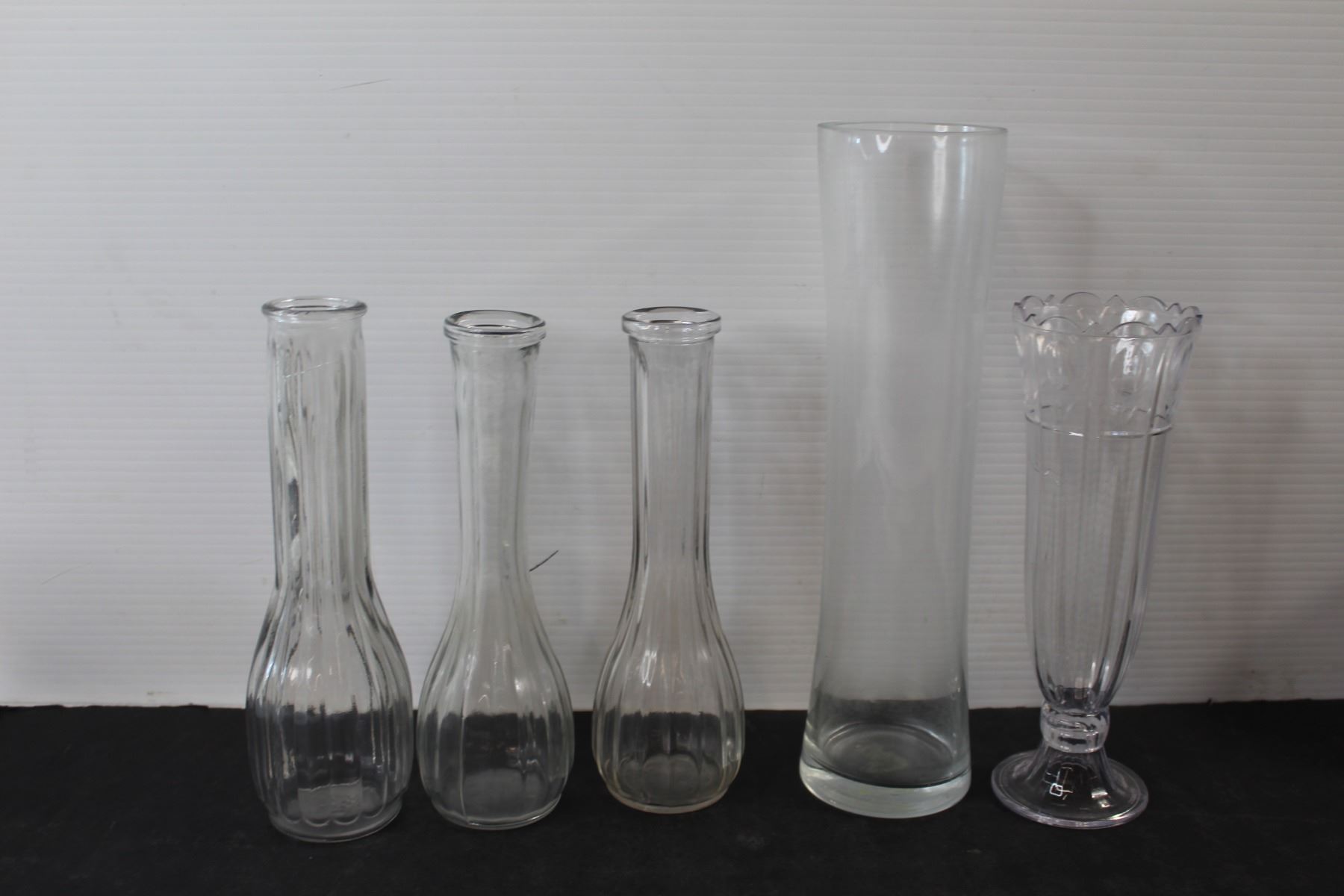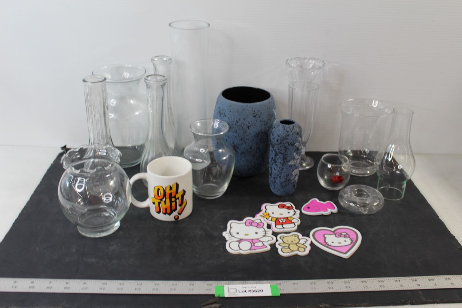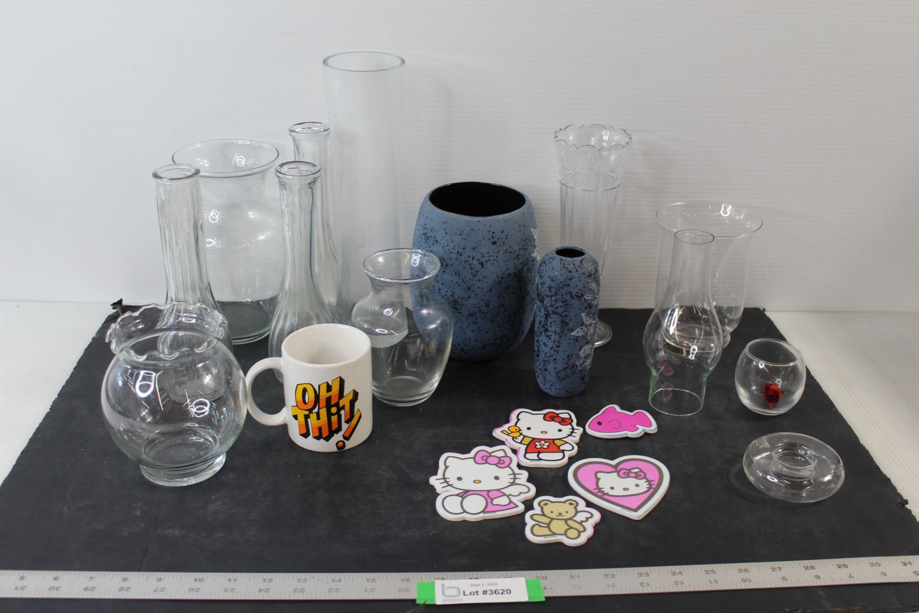 (9) Glass Vases, (2) Ceramic Vases, Oh Thit Mug, Hello Kitty Foam Stickers, Assorted Glassware