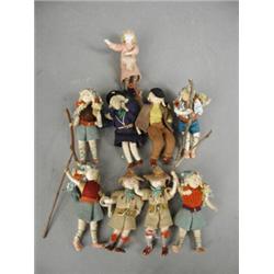 9 Grecon cloth dolls in various costume, each with wire and cloth bodies with lead feet, and a st...