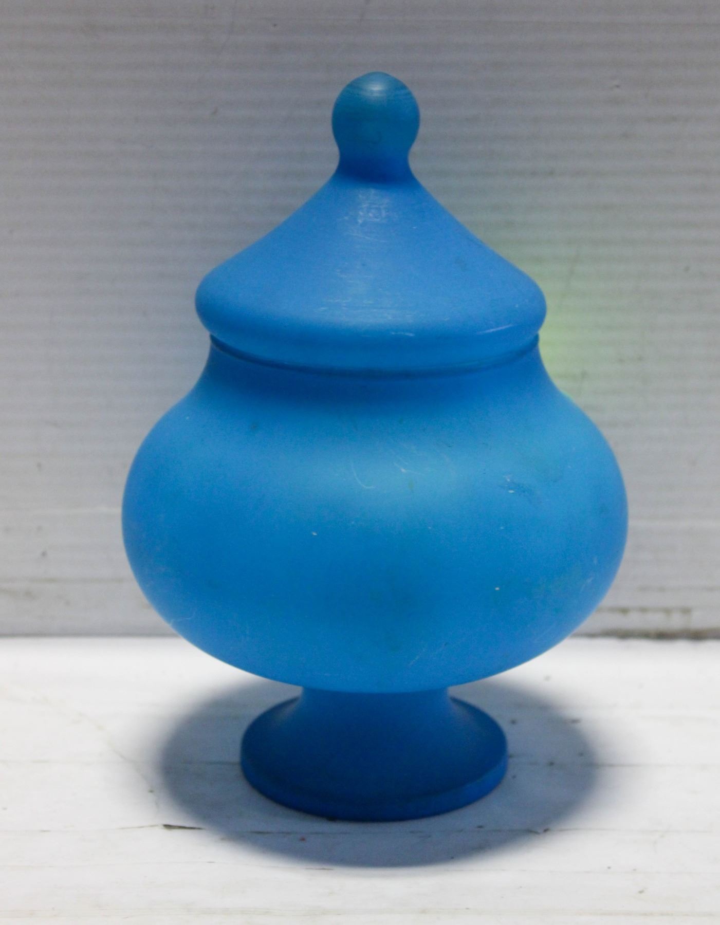 9 INCH TALL VINTAGE BLUE CANDY JAR