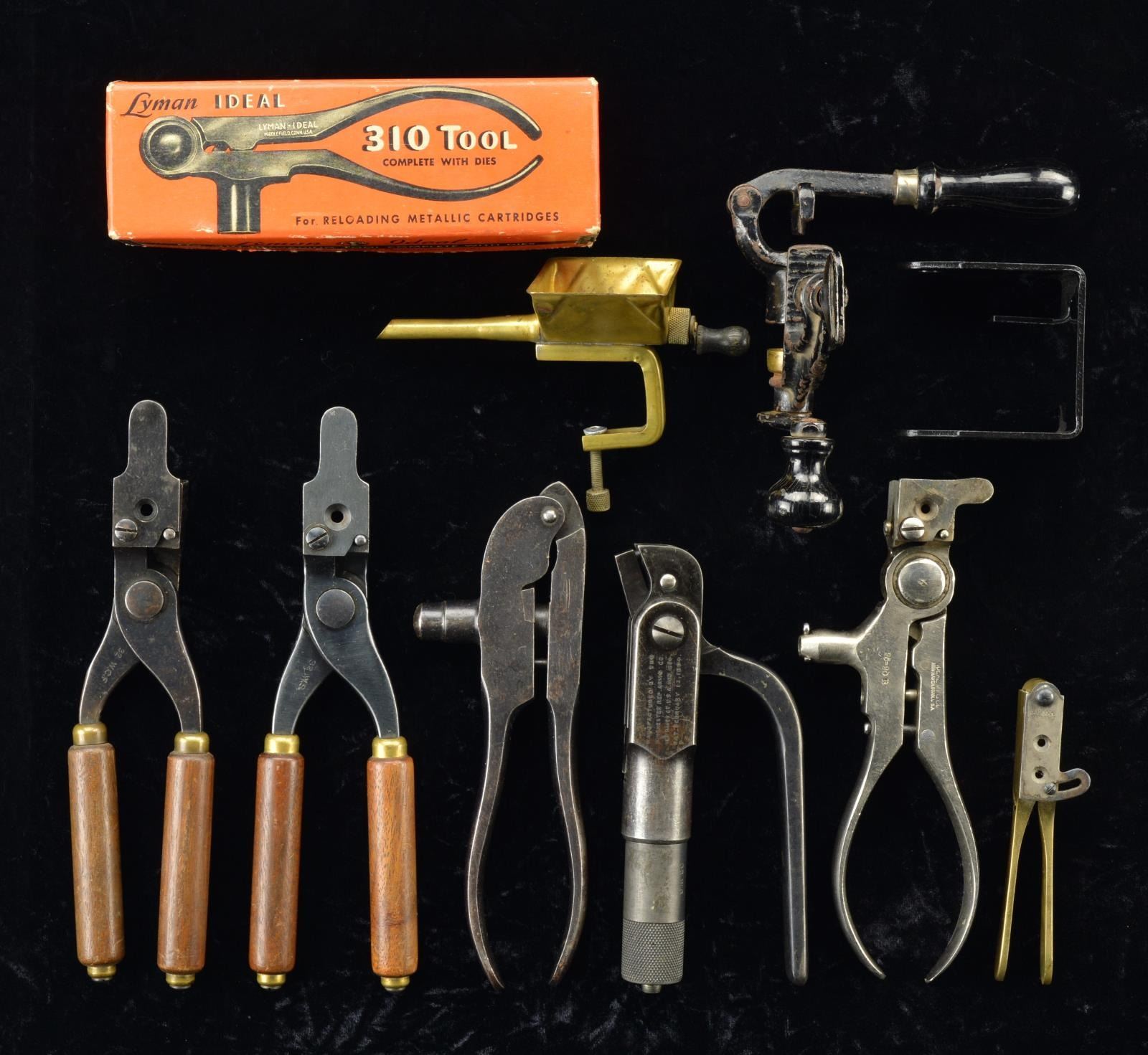 1) Ideal Ideal Model 310 loading tool w/ box, manual & 3 piece die set. CONDITION: good black painted finish w/ wear. Box good w/ fraying.