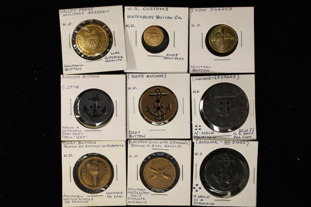 FORGE ACADEMY, ANCHORS, CROSSES CIVIL WAR CANNONS, STATUE OF LIBERTY TORCH AND IKOM ZAGREB YUGOSLAVIA MILITARY BUTTON.
