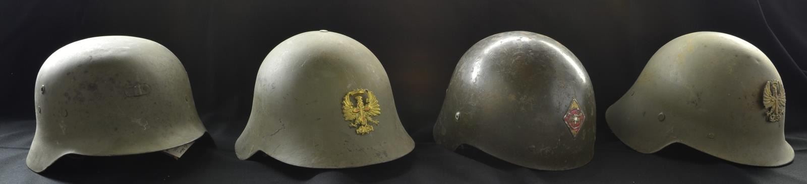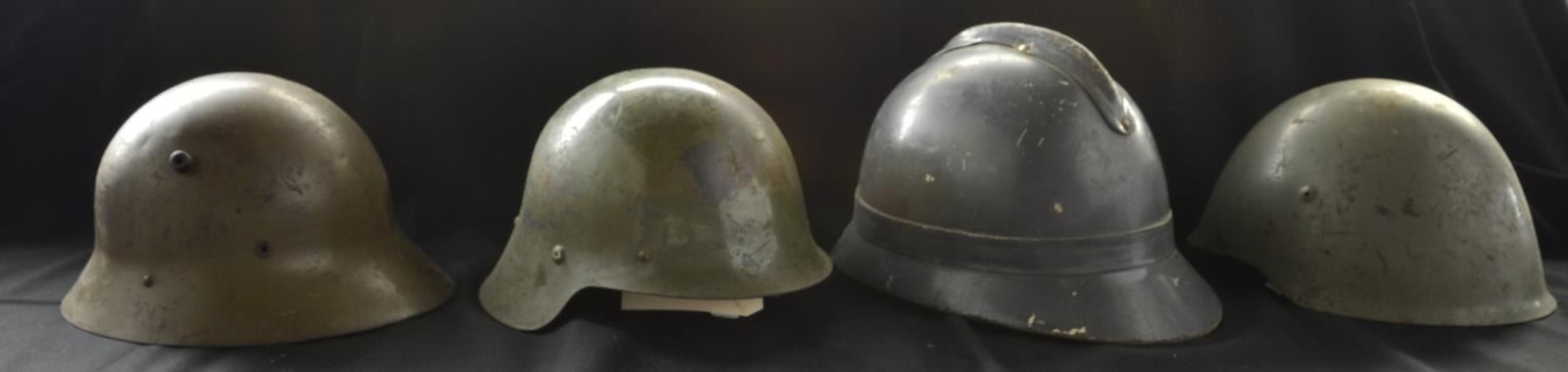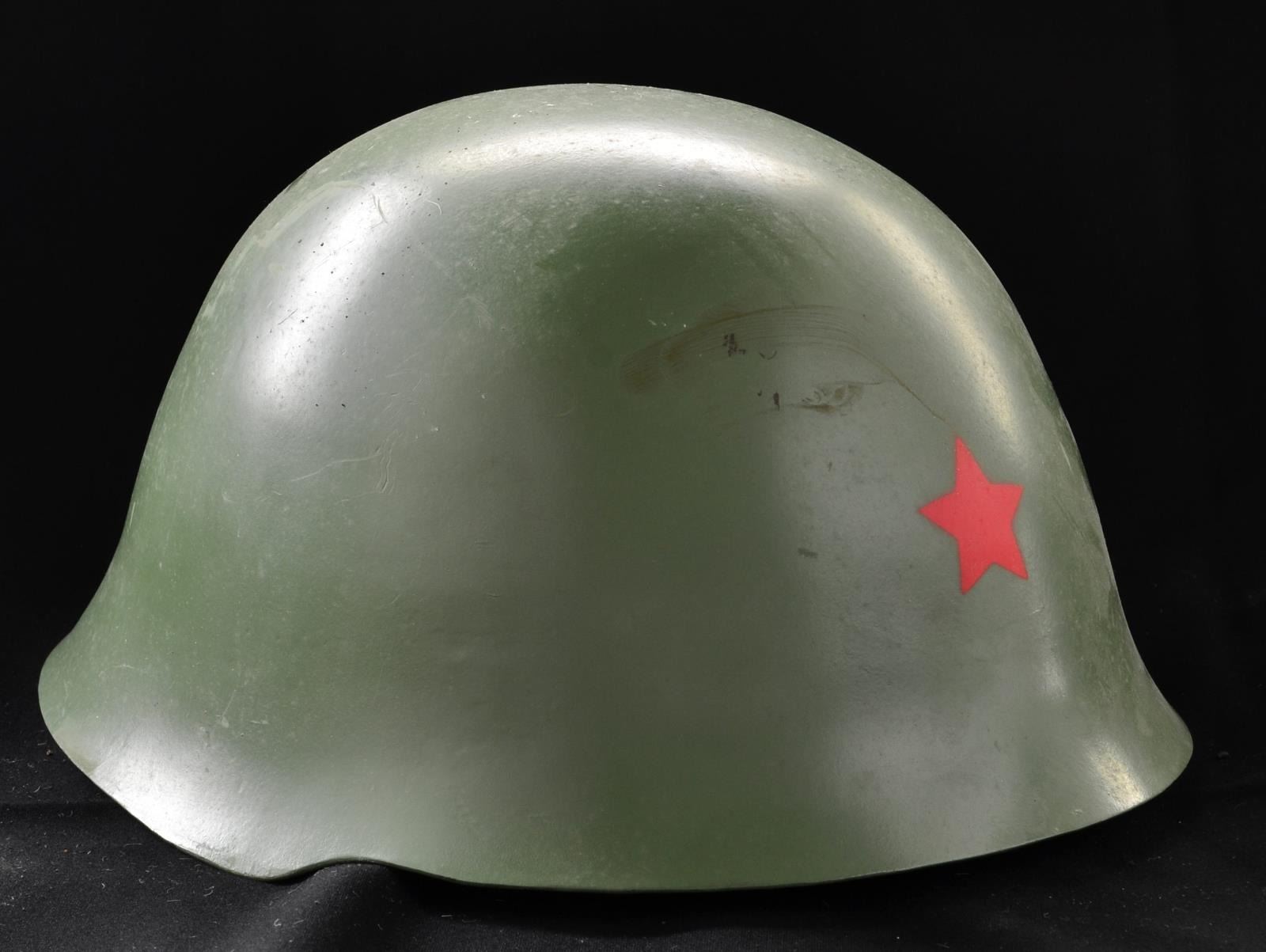 9) Yugoslavian style helmet w/ red star on front, & khaki liner. CONDITION: most are in fair to good overall condition w/ patina, flaking finish. Liners are starting to deteriorate w/ loose stitching, mildew stains & tears. (02-16448/MD). $300-500.